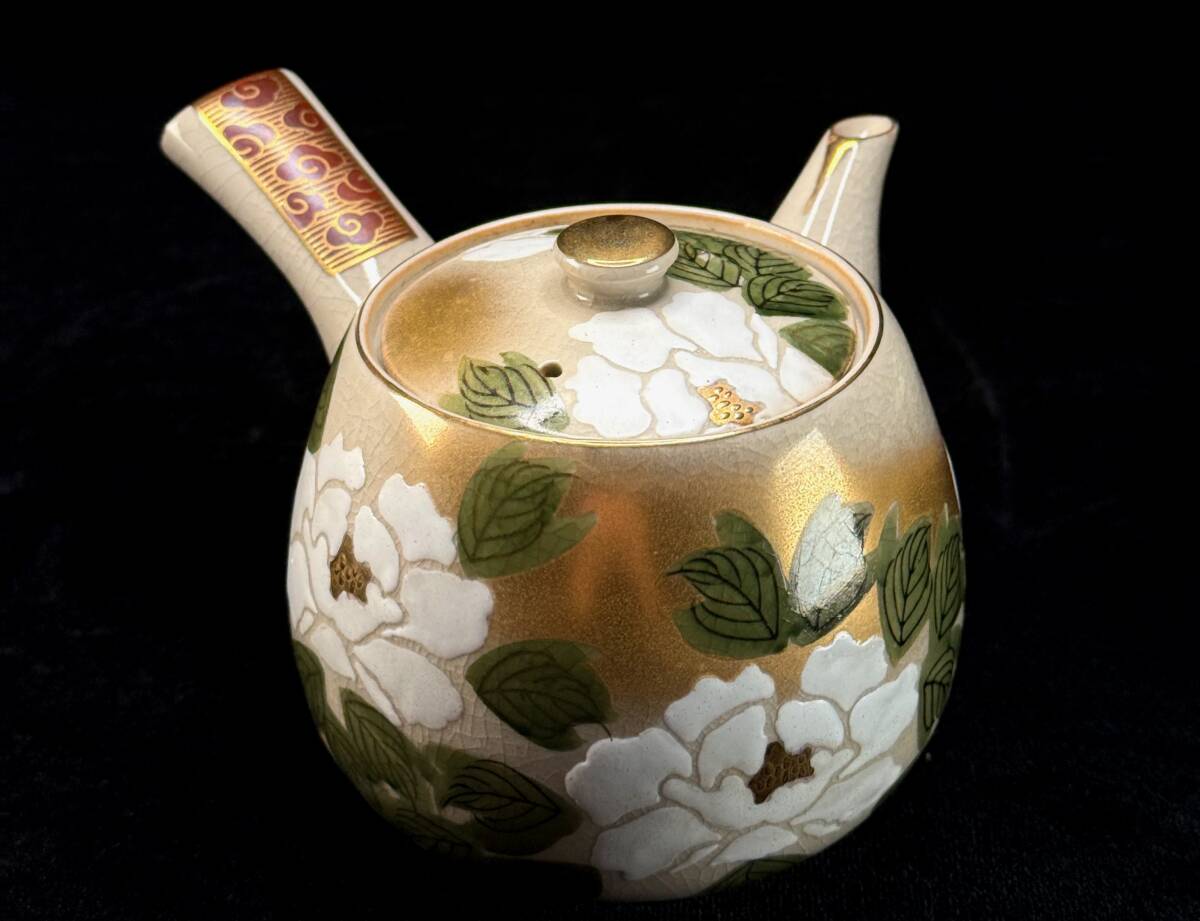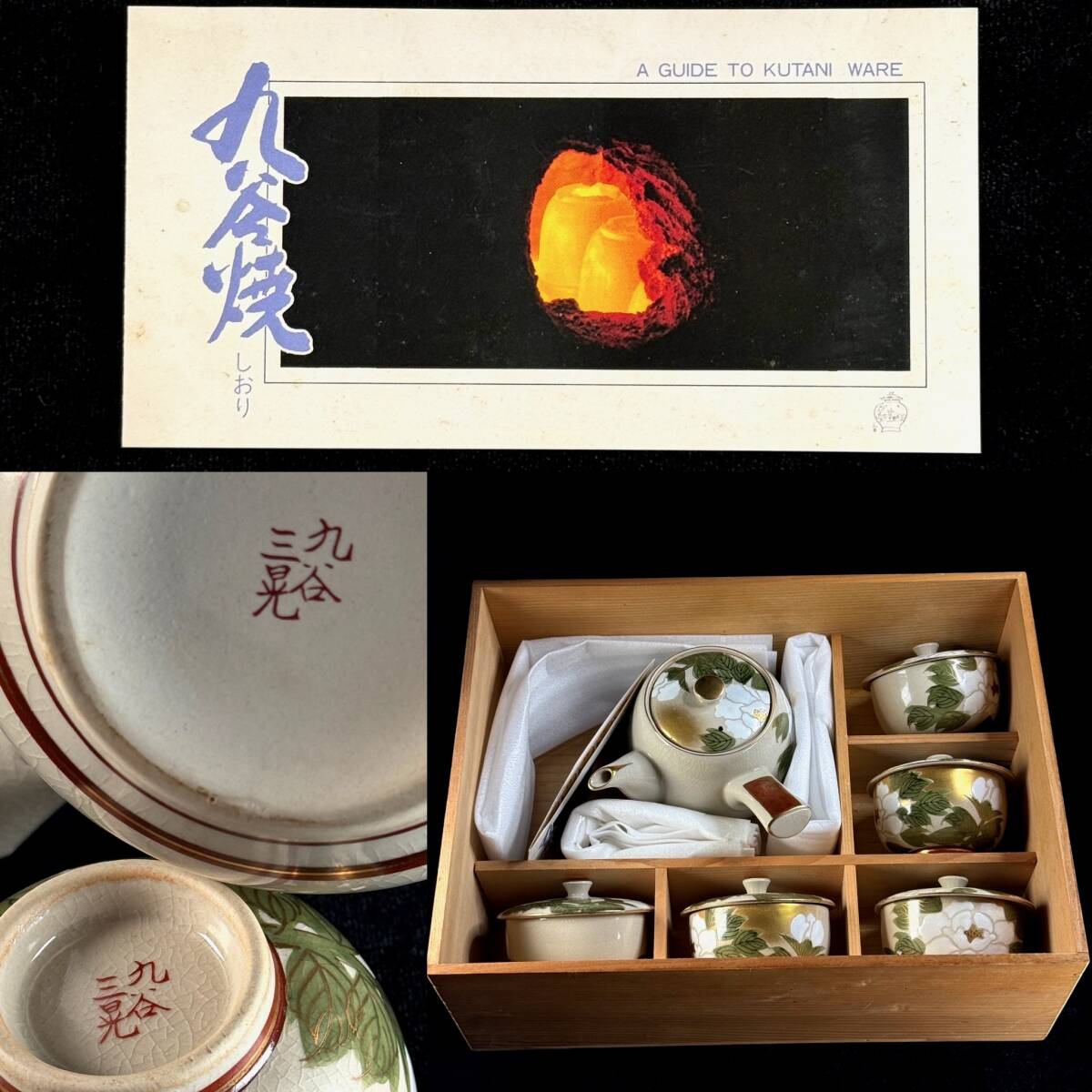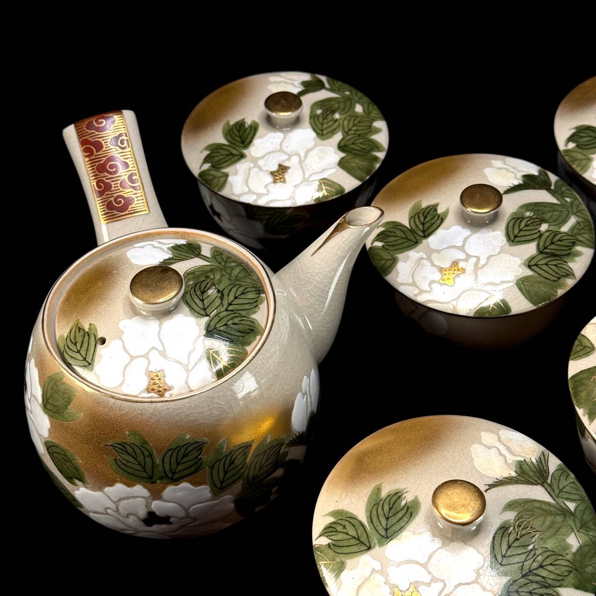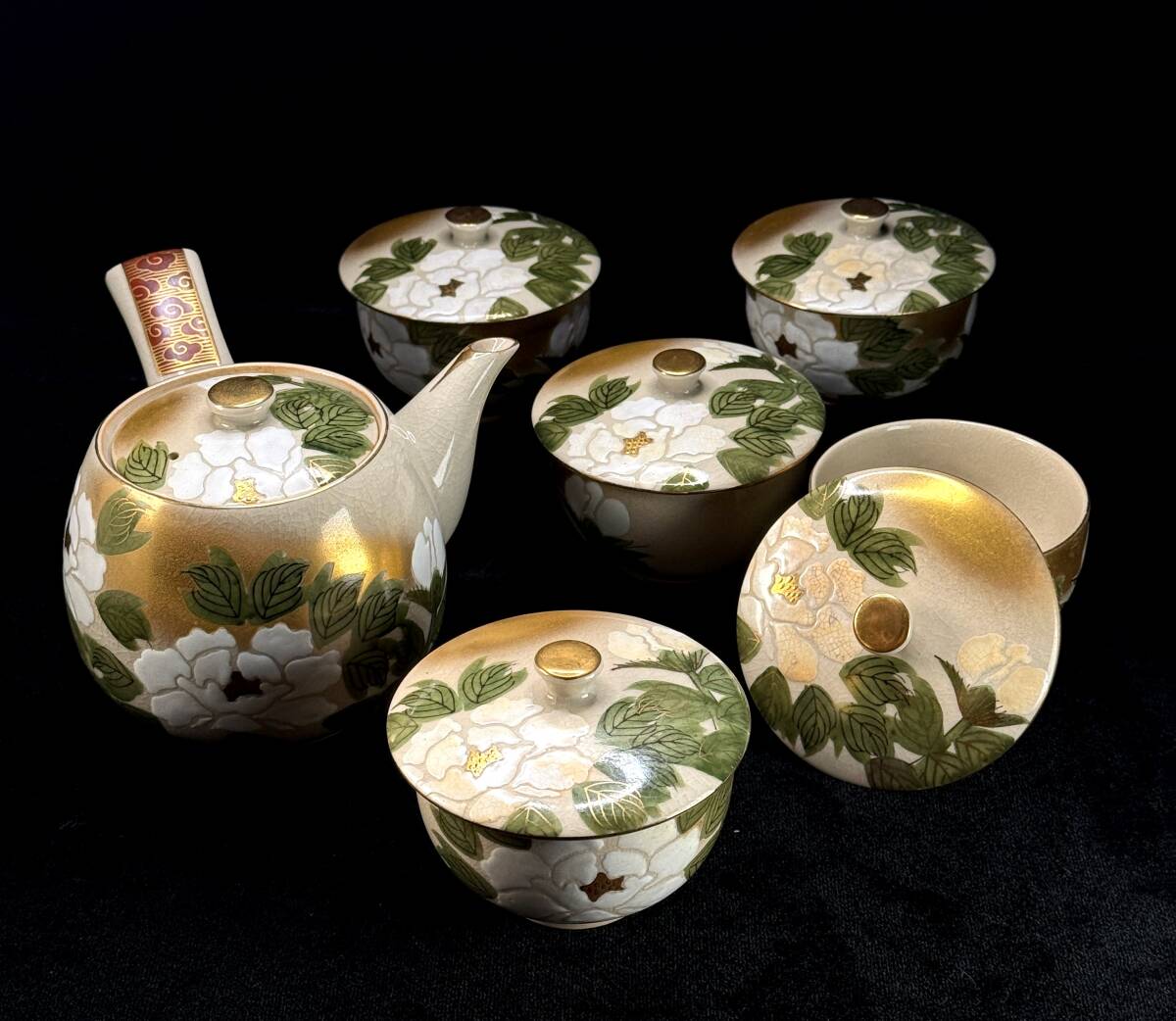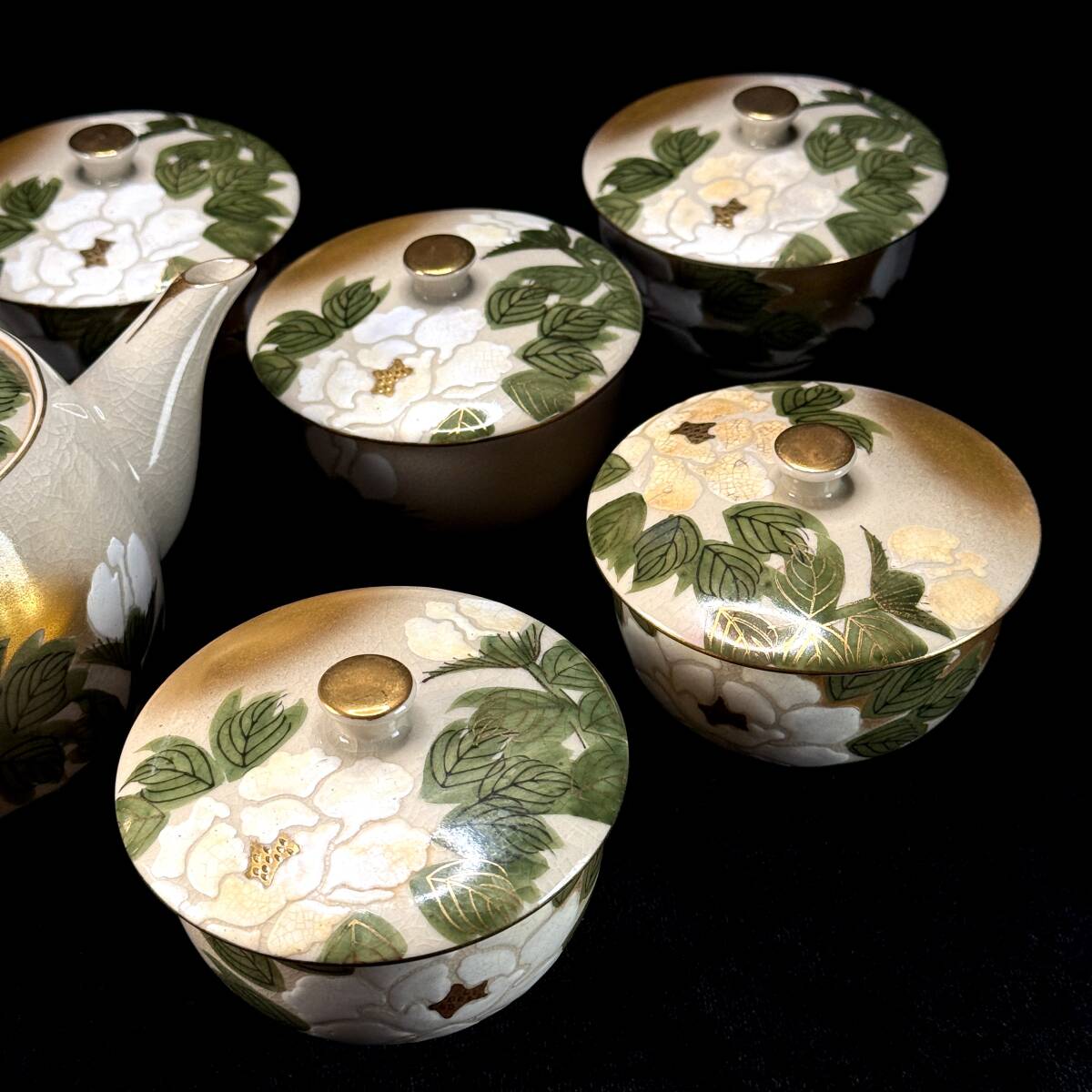 九谷焼 三晃造 金彩色絵花紋 急須 湯呑み 5客揃 煎茶器揃え 共箱 金彩と手描きによる花紋の調和が美しい逸品!
