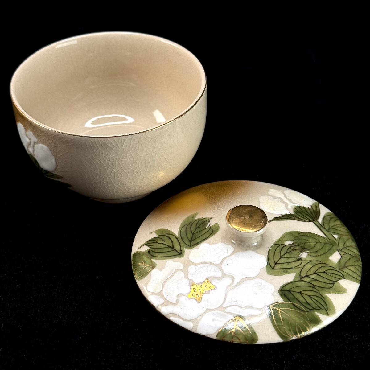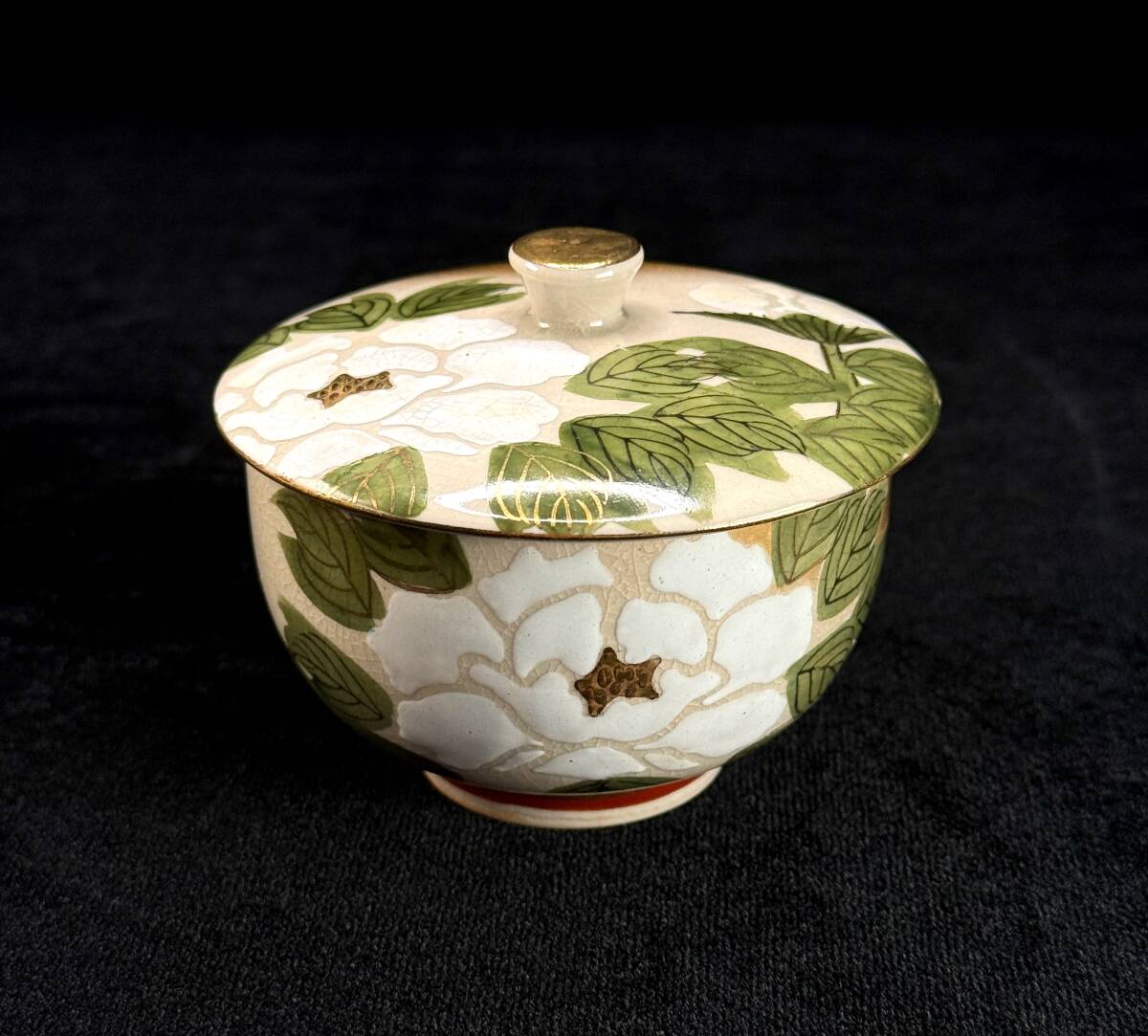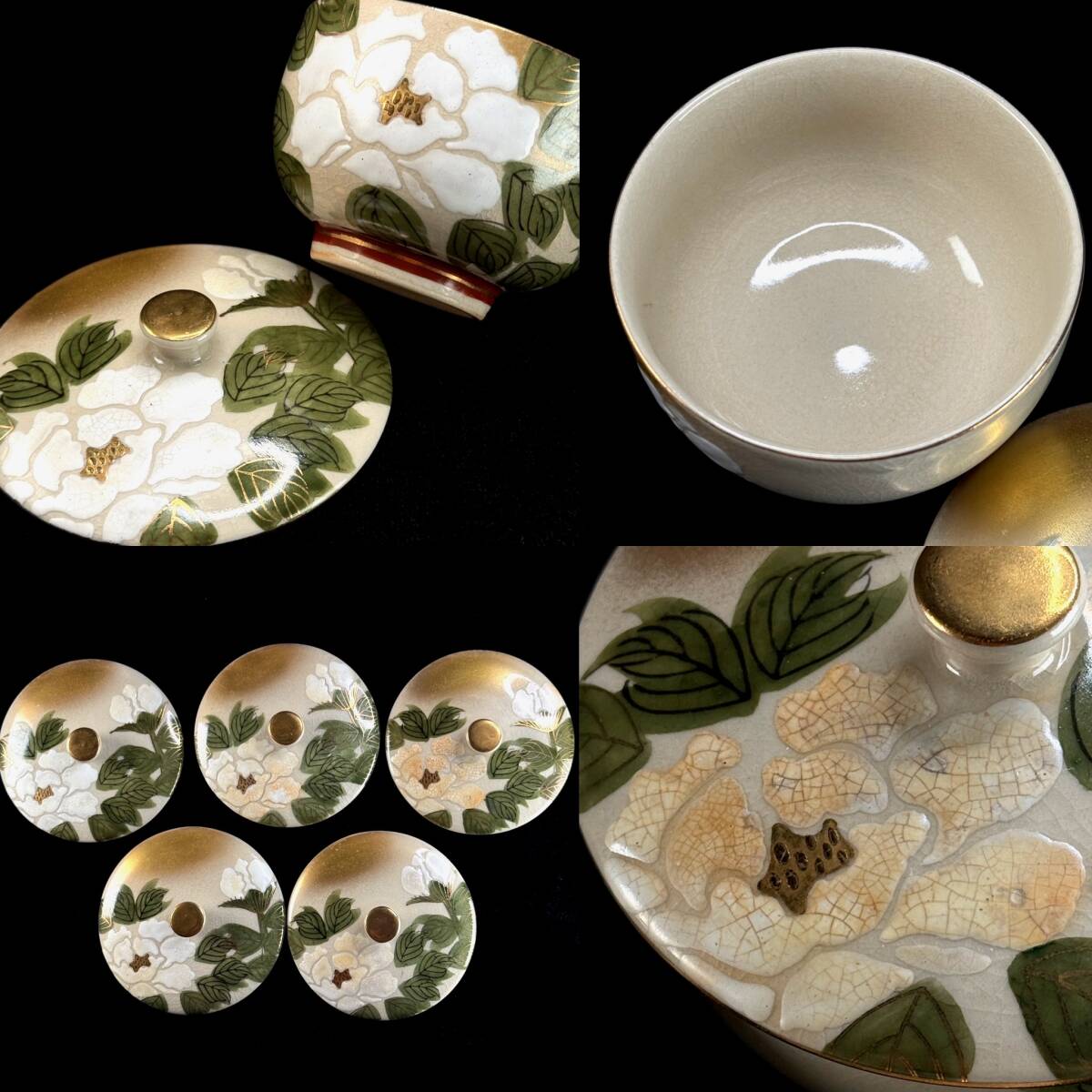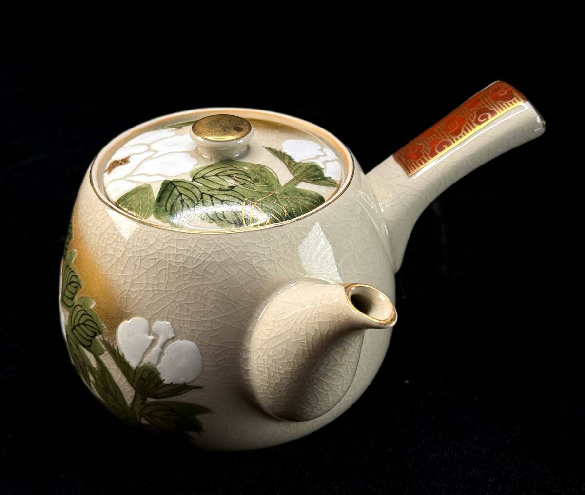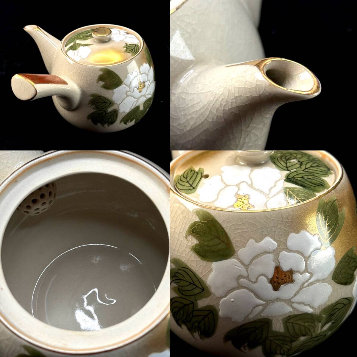 九谷焼 三晃造 金彩色絵花紋 急須 湯呑み 5客揃 煎茶器揃え 共箱 金彩と手描きによる花紋の調和が美しい逸品!