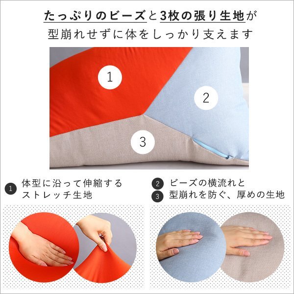 | 【ポイント】 クッションの中は極小ビーズなので、身体にフィットして気持ちよく寛げます。 伸縮性のある生地と伸びにくい生地を使用しているので、型崩れせず身体を支えます。 持ち手付きで持ち運びも楽ちん! 国内発泡で安心の日本製です。 |