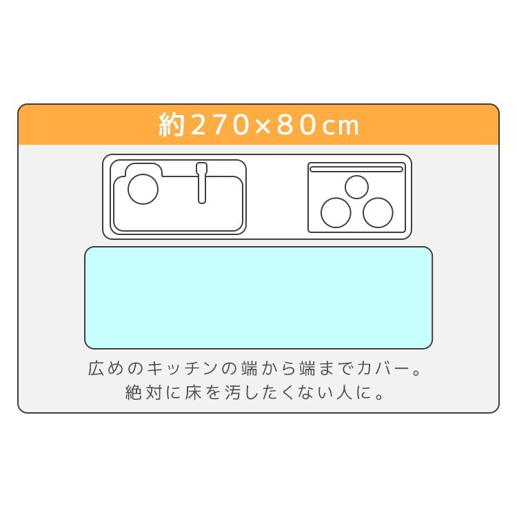 でも、汚れたマットをこまめに洗うのはめんどくさい…。 マットが滑りやすくて掃除機をかけるときにぐちゃっと丸まってしまう…。 そんなお悩みには、お洗濯不要!汚れやキズから床を守る、クリアキッチンマットがオススメです。 ■汚れ・水シミから床を守る 撥水性のあるPVC素材を使用してるので、汚れやシミに強く、 食べ物や飲み物をこぼしてもサッと拭くだけ!お手入れも簡単です。 抗菌・防カビ加工で、よりクリーンに。 ■傷や衝撃をガード 透明だから、インテリアの邪魔をしない! フローリングに敷くだけで、木目はそのままに、 落下物による凹みやテーブルや椅子の引きずりによる床へのダメージを防ぎます。 ■サラサラの感触でベタつかない エンボス加工を施しているので、べたつきを感じさせないサラサラの手触りです。 マットな質感で、フロアになじみます。 ■ピタッとズレない快適設計 裏面が床にピタッと密着してズレを防止。 角丸設計でめくれにくく、ロボット掃除機も問題なく使用できます。 ■床暖房対応の耐熱仕様 100℃の耐熱加工を施しているので、床暖房の上での使用もできます。 ■カット自由自在! お好みのサイズにカットできるので、ダイニングテーブルやキッチンフロアマットに、 学習机 デスクマット、子供の遊び場やペットの床保護マットなど、自由自在にアレンジできます。 【商品仕様】 カラー:クリア サイズ(約)80cm×270cm(厚さ1.5mm) 材質:軟質PVC 使用温度(約)-30℃~100℃ 【注意事項】 ・伸縮性のある素材のため、サイズに多少の誤差が生じる場合があります。 ・お手入れは薄めた中性洗剤を湿らした布につけ、固く絞って拭いた後、水分が残らないように乾いた布で乾拭きしてください。 ・日の当たる所で使用しないでください。日焼けで硬化する場合があります。 ・商品は、モニターによって色合いが異なって見える場合があります。 ・仕様・デザインは改良のため予告なく変更することがあります。 |