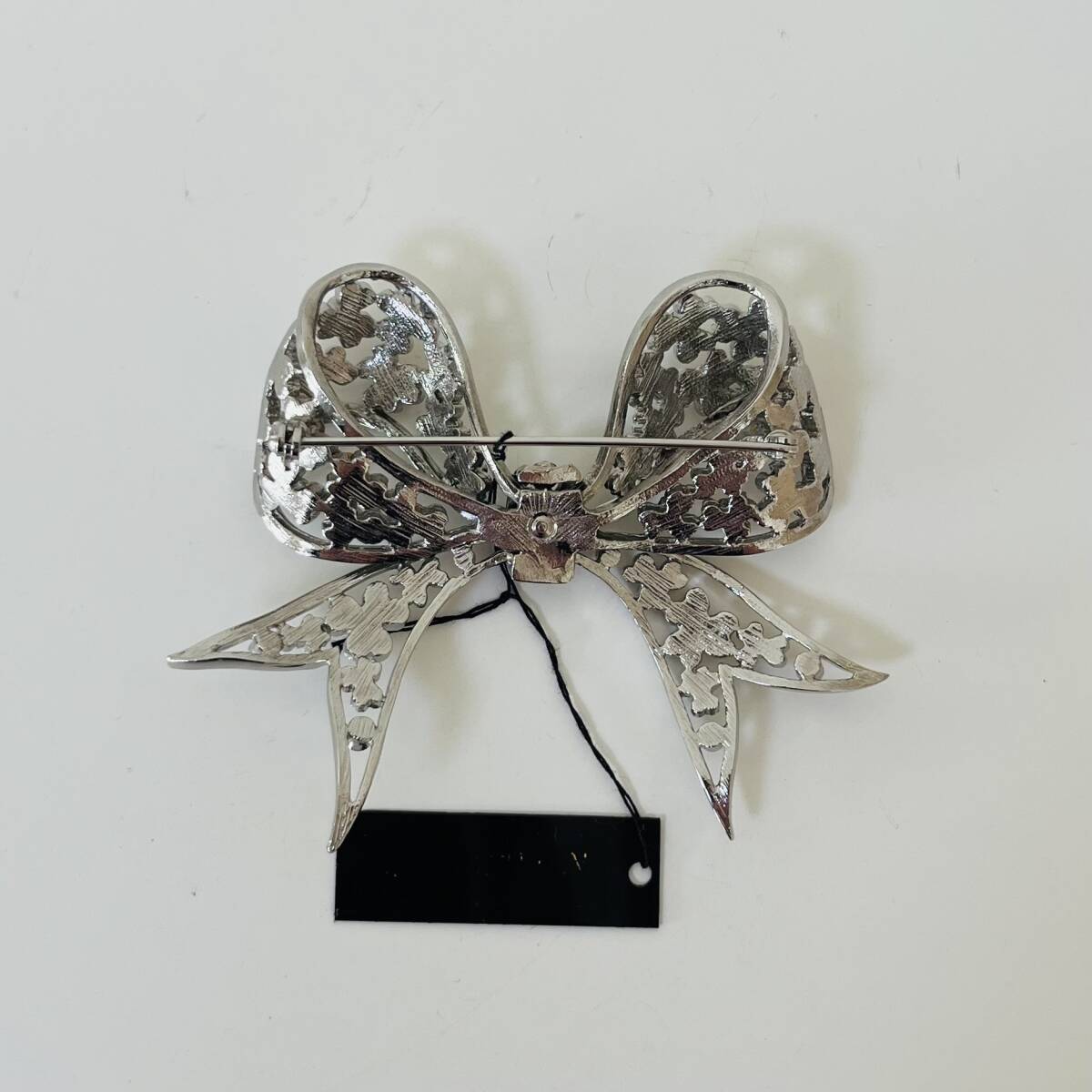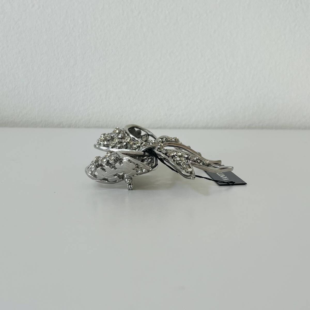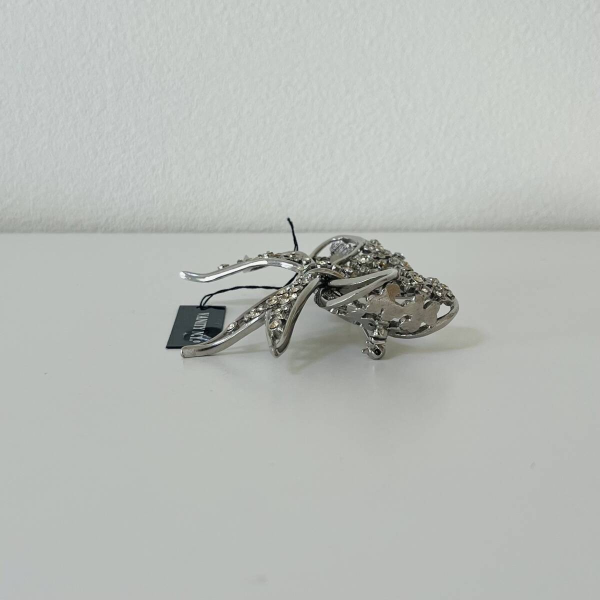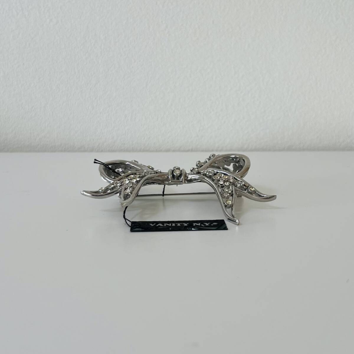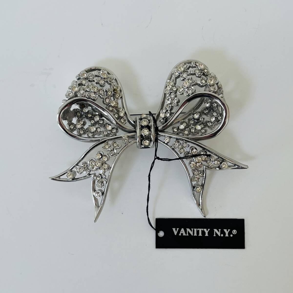 596③VANITY N.Y.タグ付き ブローチ アンティーク ビンテージ アクセサリー 未使用保管品!シルバーカラー ラインストーン 華やか キラキラ リボン