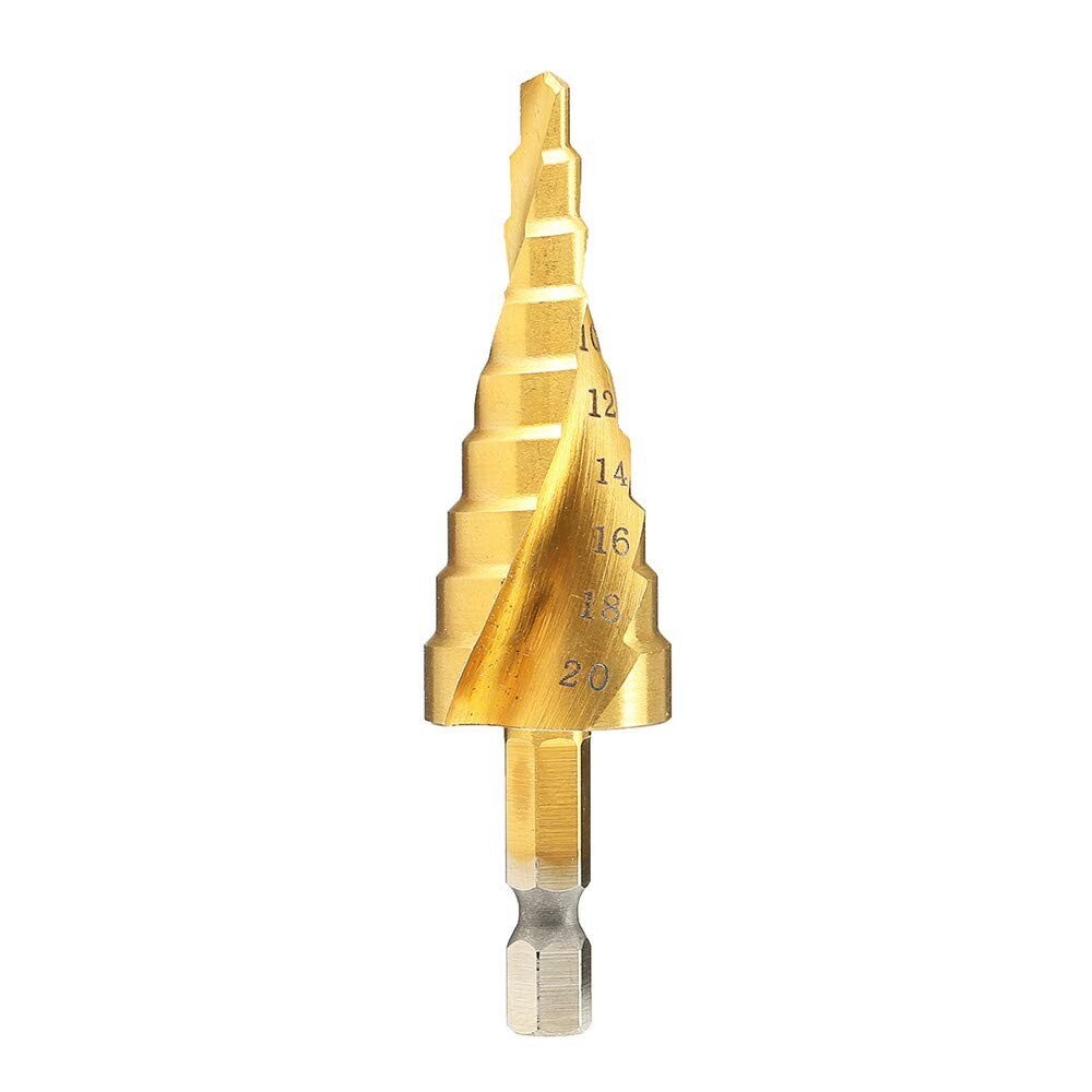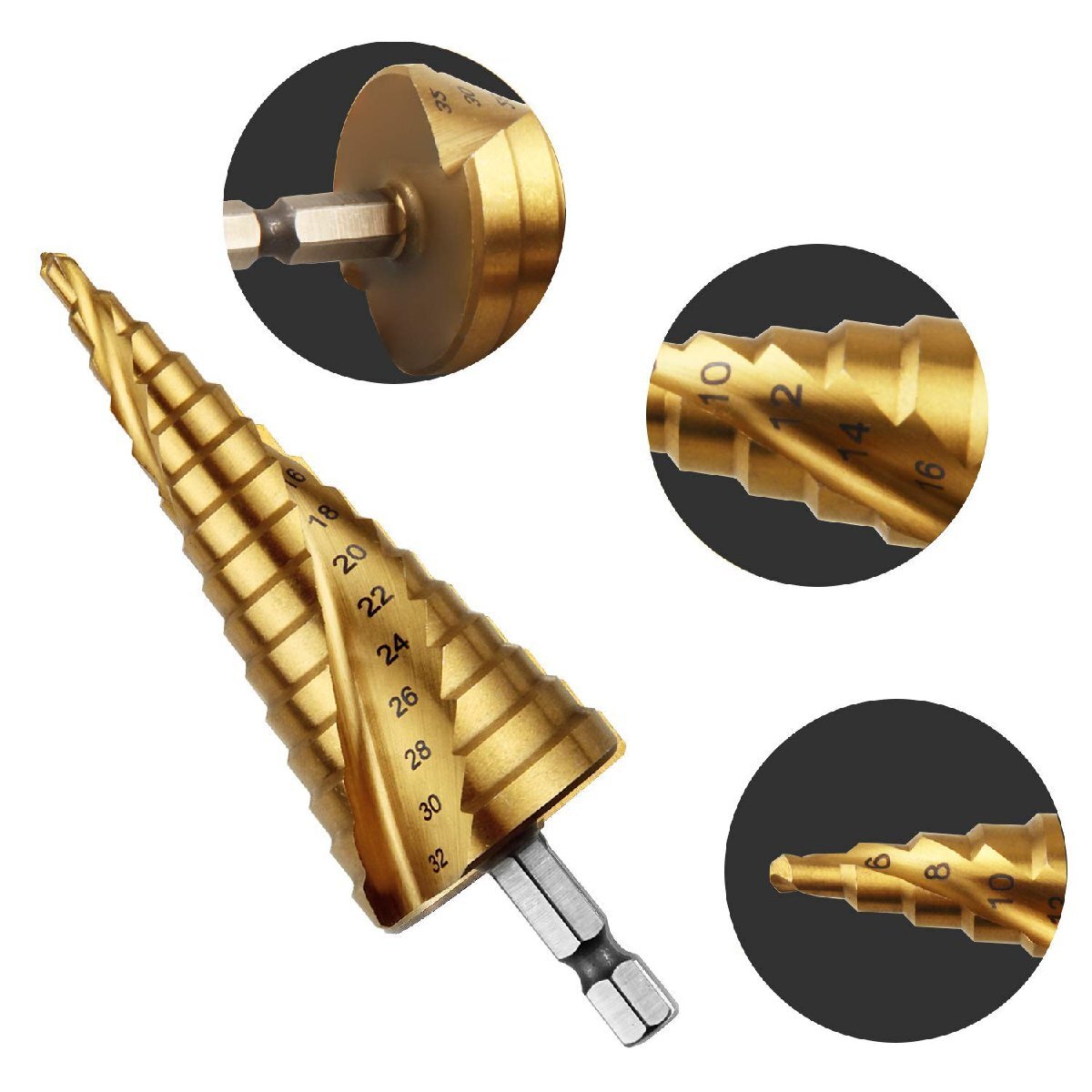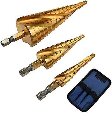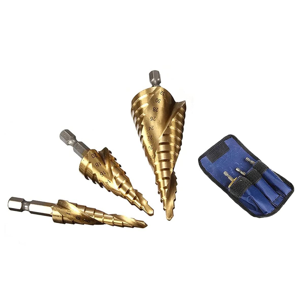 HSS鋼タイプのステップドリル3本セット。 薄い鉄板・アルミ板・木材・樹脂等の穴あけと穴の拡大に適した切削工具です。 穴あけ・下穴拡大・面取り・バリ取りなどの作業がこちらの3本セットで全て可能!スパイラル溝で切れ味UP!切りくずが少ない。用途:薄い鉄板・アルミ板・木材・樹脂等の穴あけと穴の拡大サイズ:・4-12mm(4/6/8/10/12mm)段数:5段・4-20mm(4/6/8/10/12/14/16/18/20mm)段数:9段・4-32mm(4/6/8/10/12/14/16/18/20/22/24/26/28/30/32mm)段数:15段 軸径:六角軸 約6.35mm対応機種:インパクトドライバー・電気ドリル・充電ドリル(充電ドリルは12V以上をご使用ください。) 材質:高速度鋼(HSS鋼、ハイス鋼) 、チタンコーティング専用ナイロンポーチが付属します。