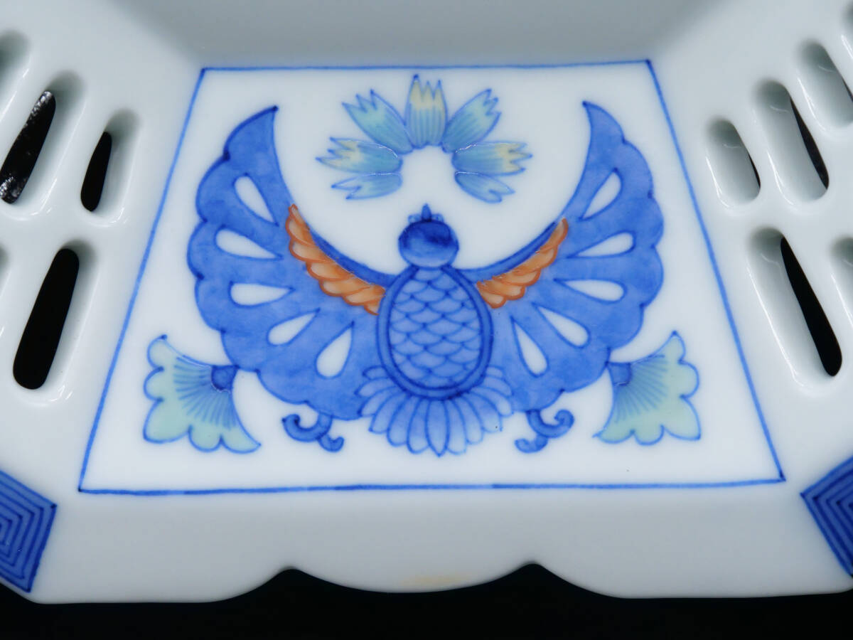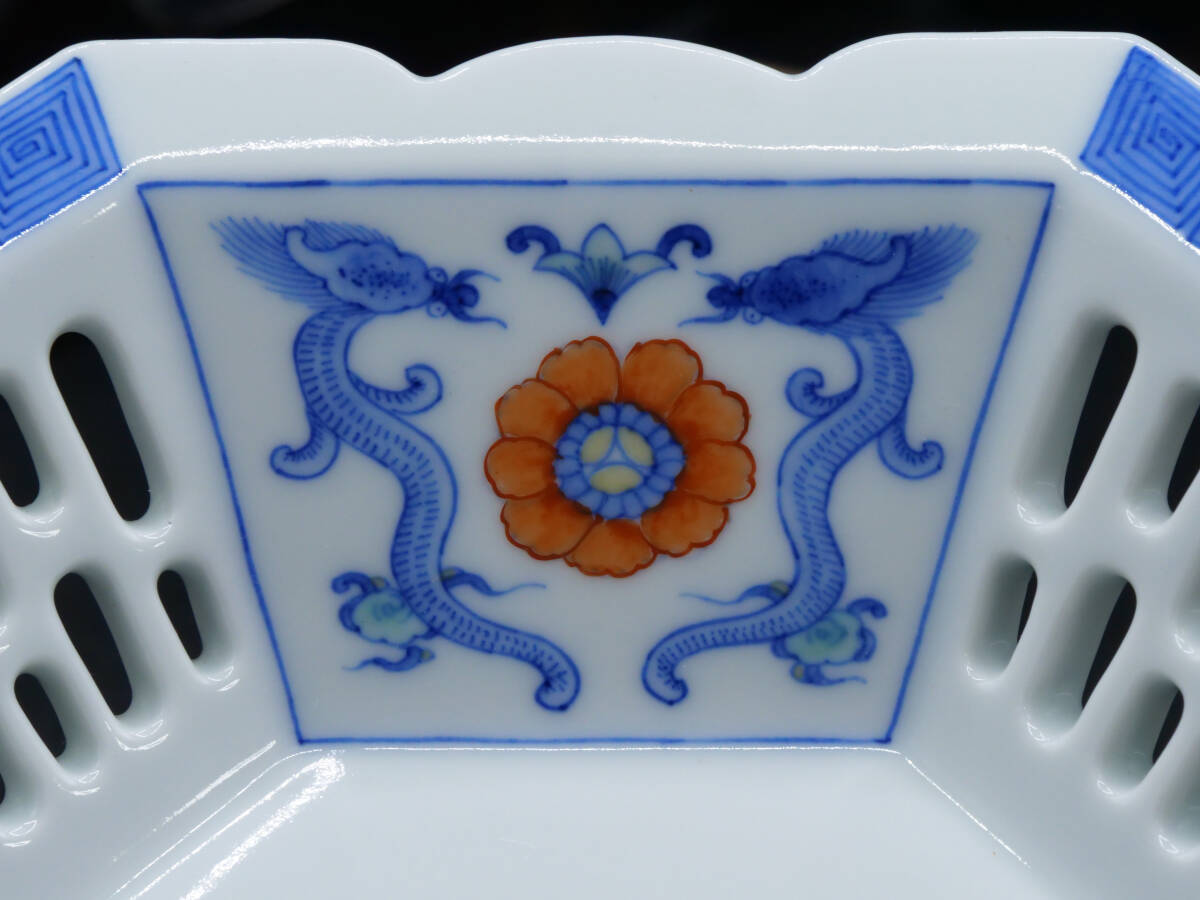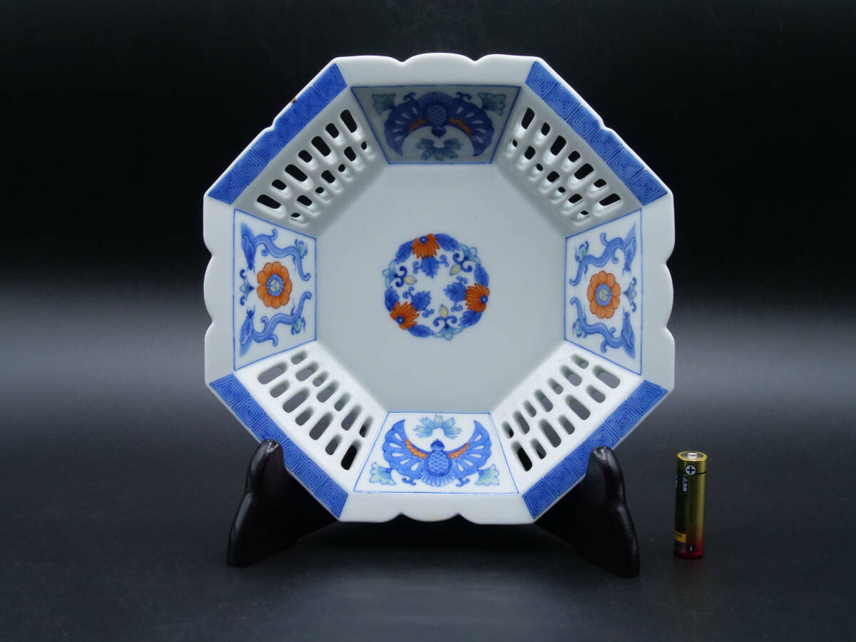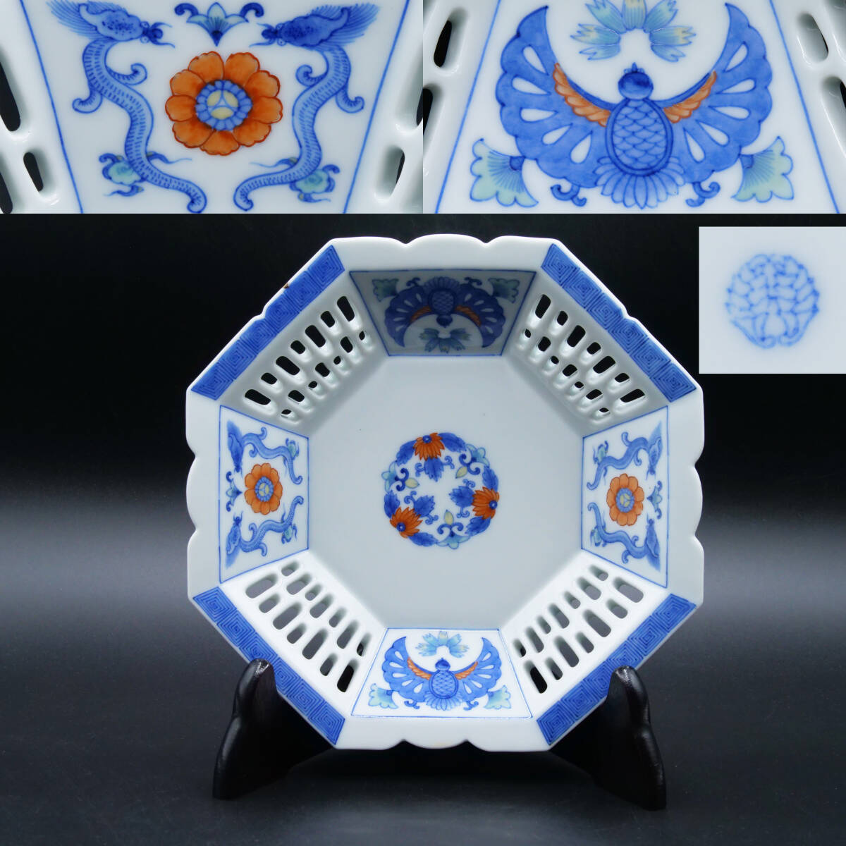 鍋島御庭焼 色鍋島 福良雀 膨雀 龍 透かし 八角 菓子鉢 盛器 櫛高台 ※金継ぎ 金直しあり 市川光春