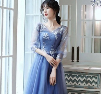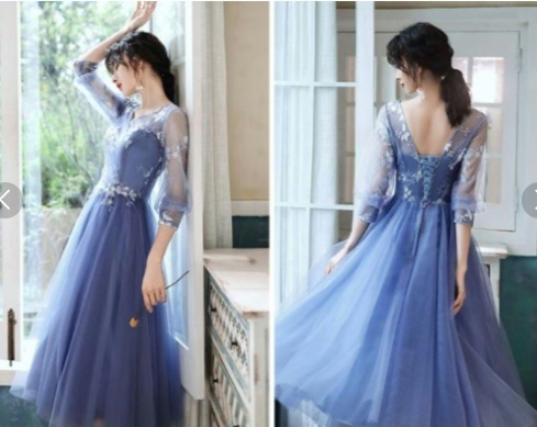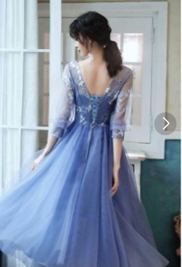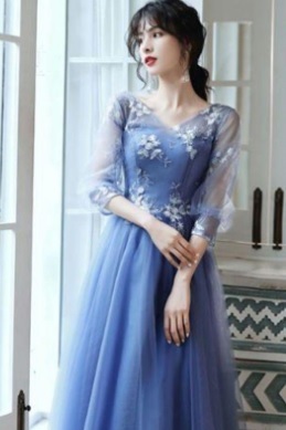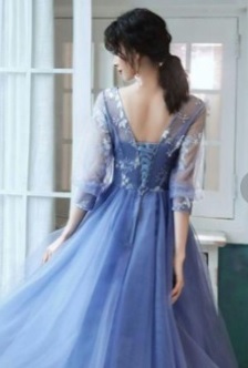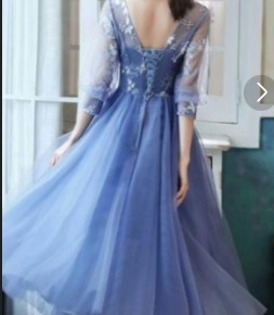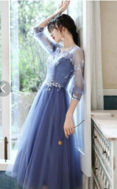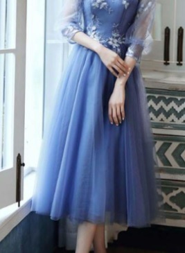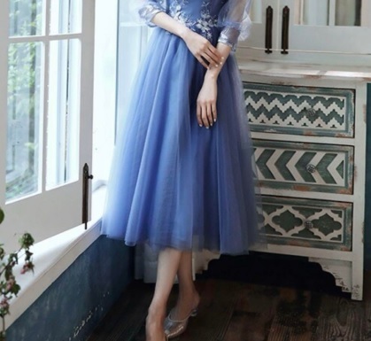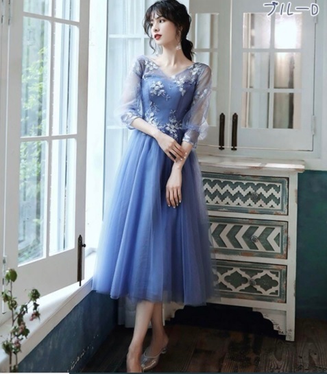 チュールと刺繍のパーティードレス。袖やデコルテの透け感がとても美しく大人の女性を醸し出してくれるエレガントなデザイン。上半身と袖には水色のボタニカル刺繍を施し、下半身はたっぷりとチュールを使用した豪華でデザイン性のあるスタイルがとても魅力的な一着です。全体的に優しい感じに仕上げられています。背中はウエストまで編み紐掛け仕様なので、紐の締め具合でバストサイズが調整できます。背中編み紐掛け。腰下ファスナ-有。胸パット付き。裏地有。