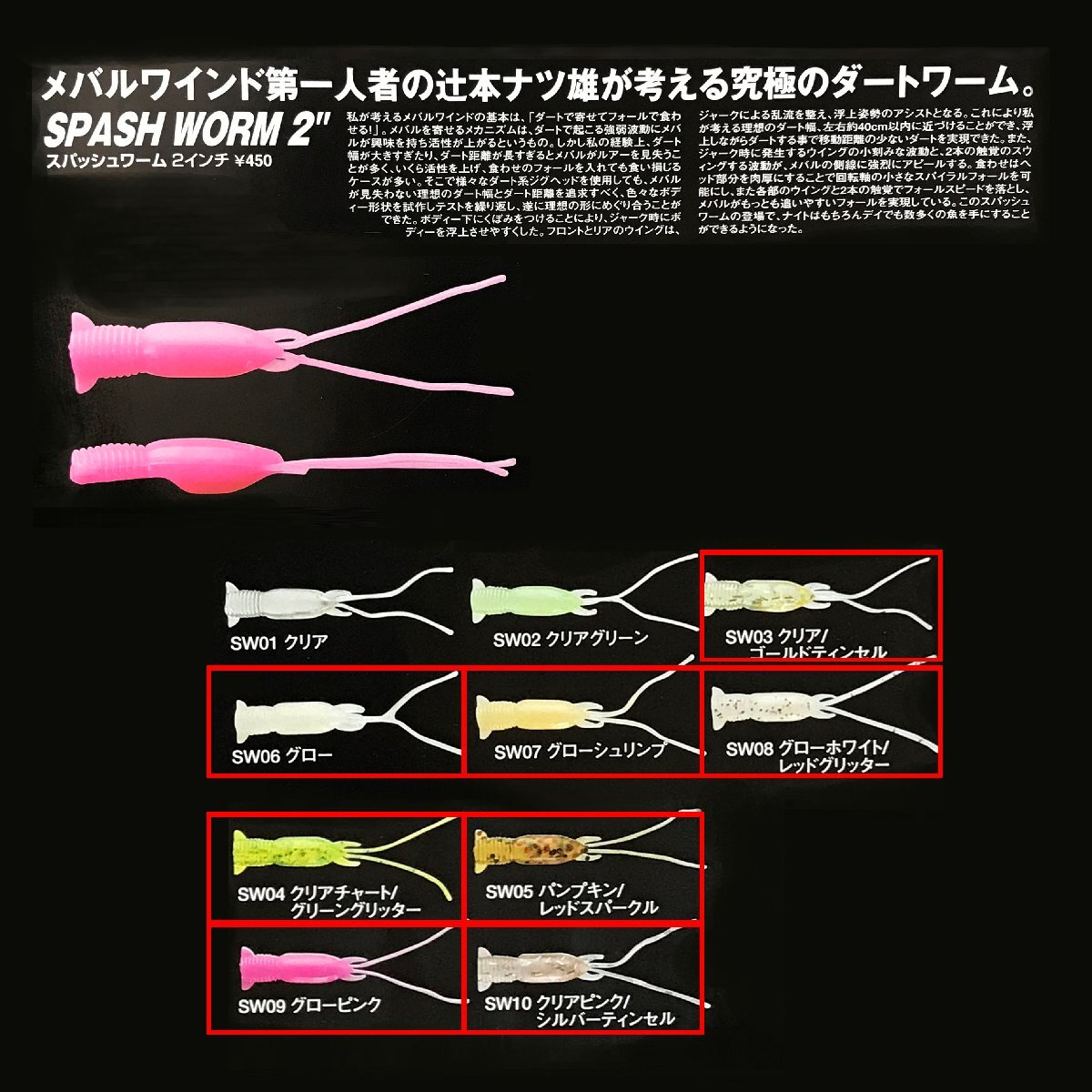 | 商品 | オ森i518 大量セット! OFT/オフト スパッシュワーム 2インチ 8色セット 計1000本セット ◆グローシュリンプ(SW07):200本 ◆グローピンク(SW09):200本 ◆クリア/ゴールドティンセル(SW03):100本 ◆クリアチャート/グリーングリッター(SW04):100本 ◆パンプキン/レッドスパークル(SW05):100本 ◆グロー(SW06):100本 ◆グローホワイト/レッドグリッター(SW08):100本 ◆クリアピンク/シルバーティンセル(SW10):100本 ☆新品☆ |