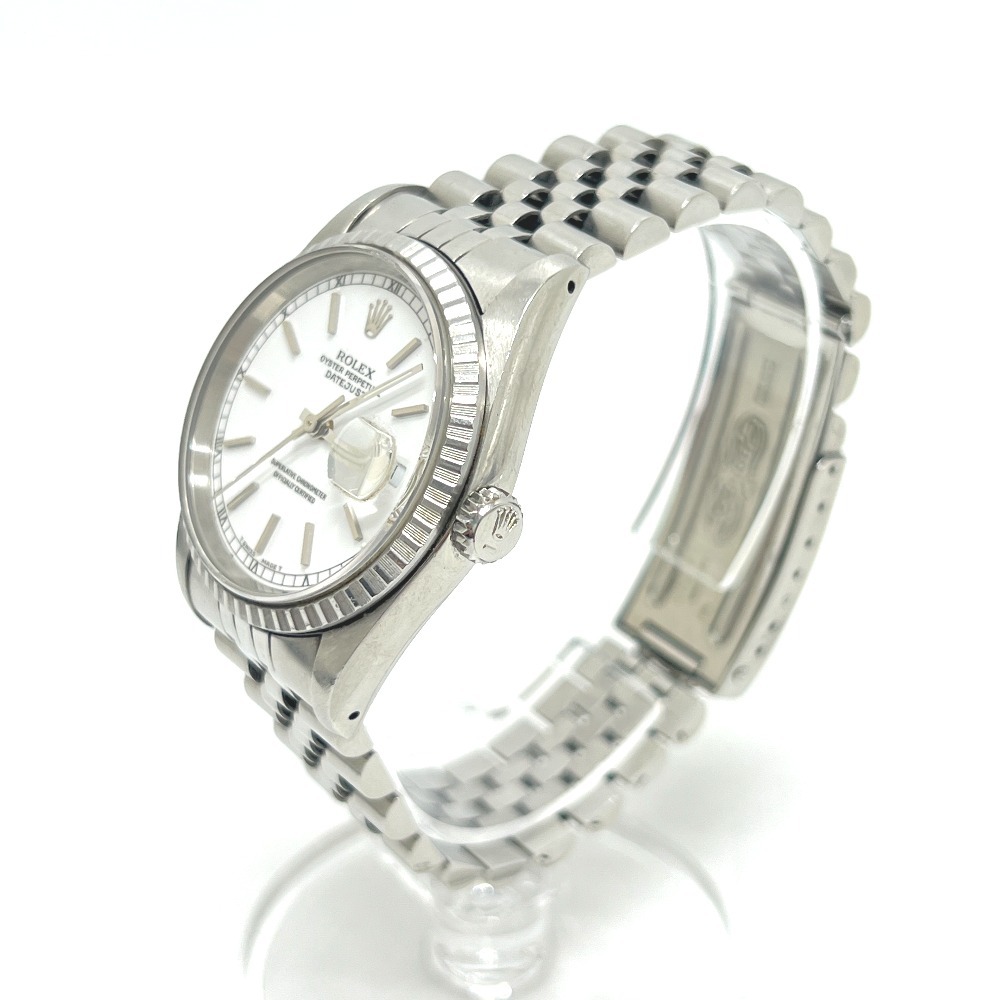 商品説明高い精度を誇る自動巻きムーブメントを搭載した、ロレックスの定番デイトジャストです。流行に左右されない普遍的なデザインは、オンオフ問わずあらゆるシーンに馴染みます。特徴的なエンジンターンドベゼルが、シンプルな中に洗練されたアクセントを加えています。