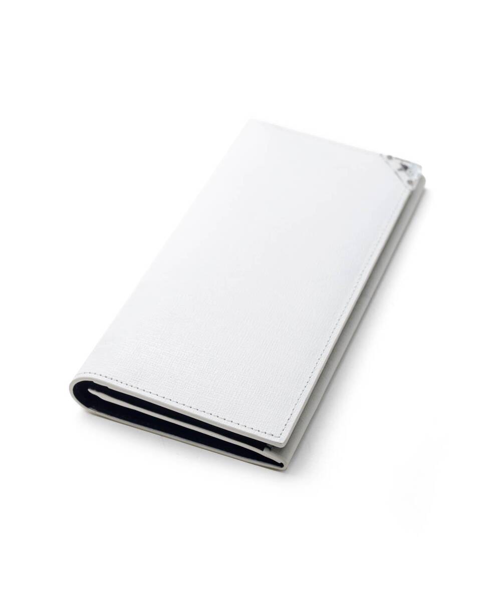 本体素材に型押し牛革にシルバーの刷毛ムラプリントを施した素材を使用したランバンオンブルーの革小物シリーズ。