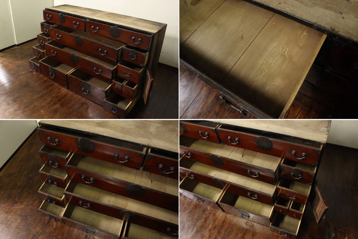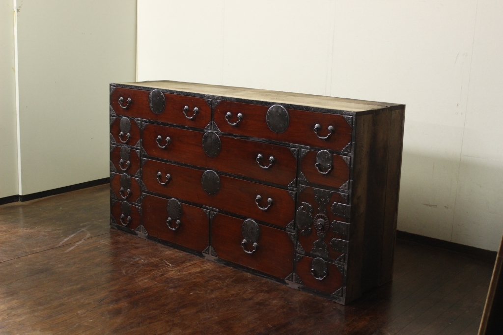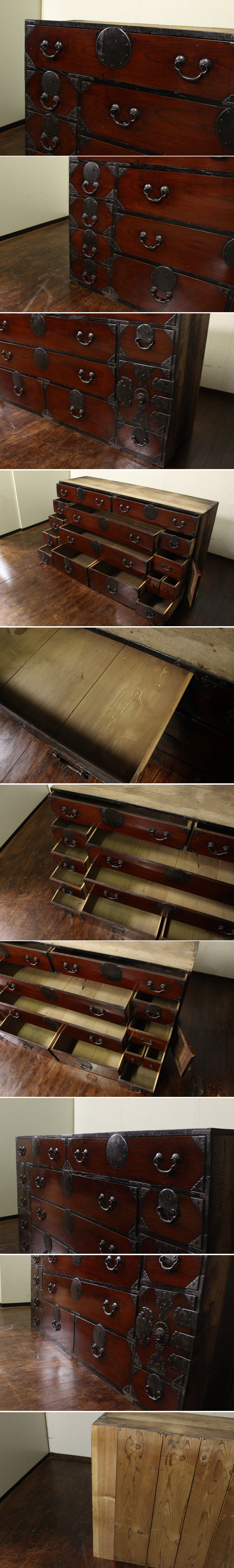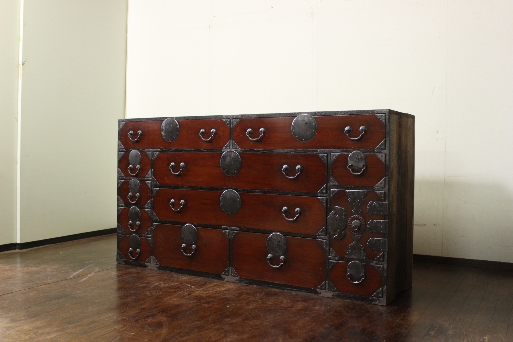 一間のものは非常に珍しく、なかなかお目にかかれない、貴重な逸品です。 古い家屋の収納部にはめこまれ使用されていました。 今では貴重なアイテムになってきている当時の時代箪笥。 引出し前板には欅材、引出しは大小15杯、 シンプルながら大きな丸型の錠前、木瓜型の引手も素敵です。 本体天板や側板などには栗材が使われています。 天板や側板ははめ込まれて見えない為、荒いままの仕上がりです。 ご自宅はもちろん、店舗などでの 和の趣と渋さの漂う空間づくりにいかがでしょうか。 |