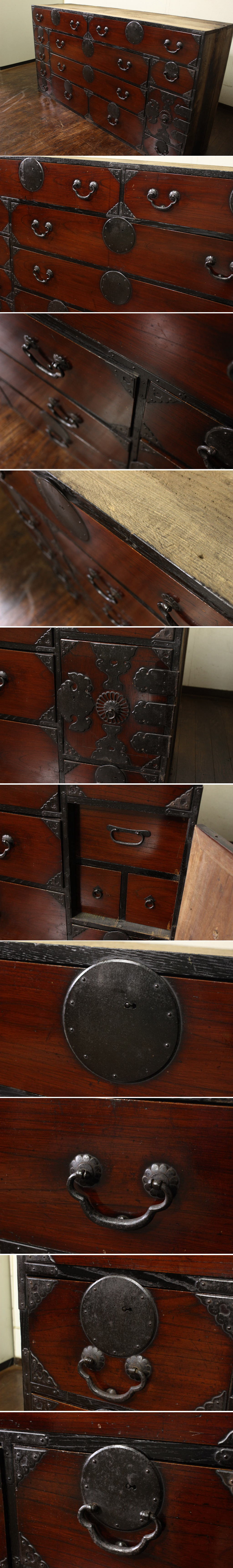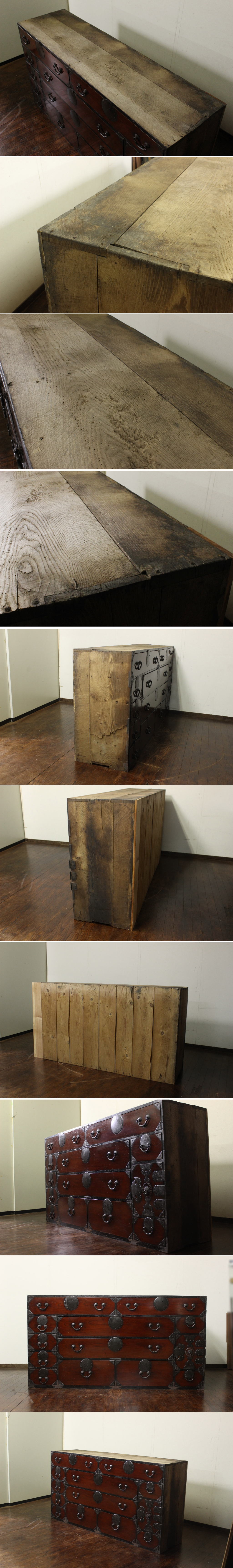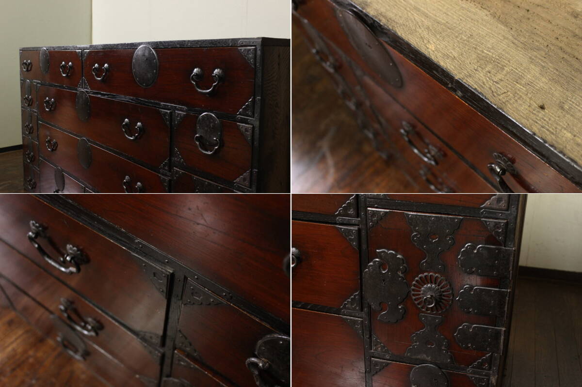 一間のものは非常に珍しく、なかなかお目にかかれない、貴重な逸品です。 古い家屋の収納部にはめこまれ使用されていました。 今では貴重なアイテムになってきている当時の時代箪笥。 引出し前板には欅材、引出しは大小15杯、 シンプルながら大きな丸型の錠前、木瓜型の引手も素敵です。 本体天板や側板などには栗材が使われています。 天板や側板ははめ込まれて見えない為、荒いままの仕上がりです。 ご自宅はもちろん、店舗などでの 和の趣と渋さの漂う空間づくりにいかがでしょうか。 |