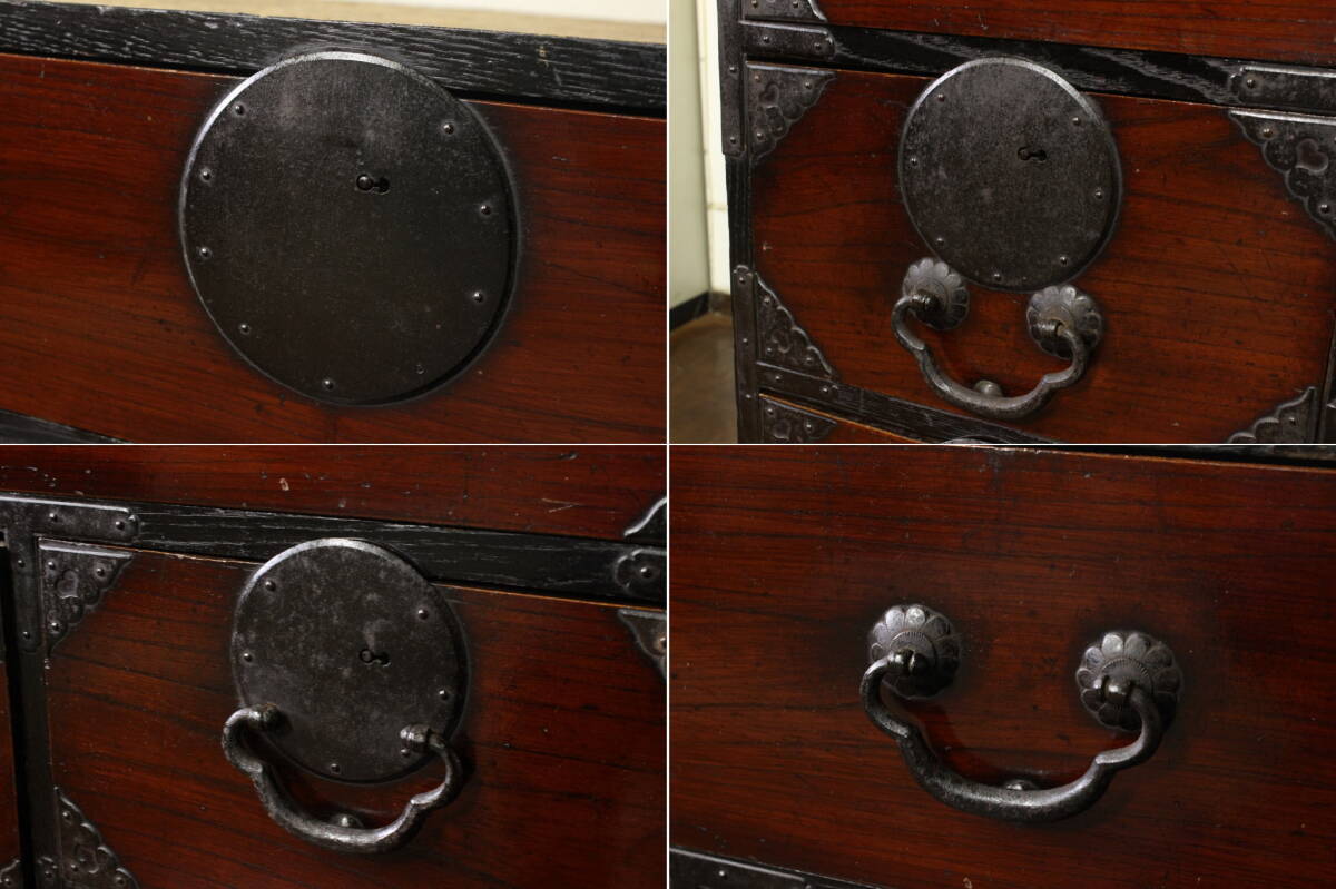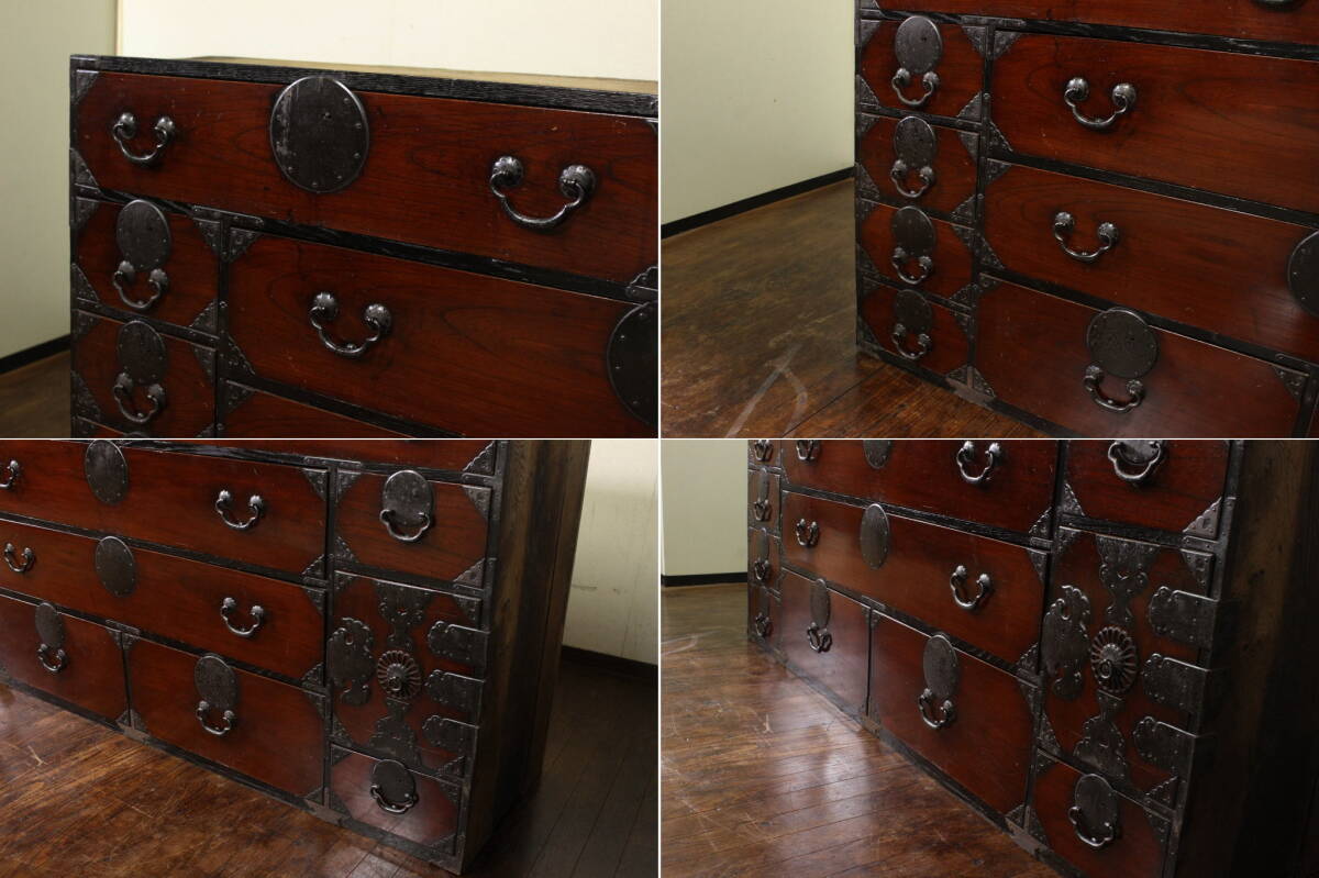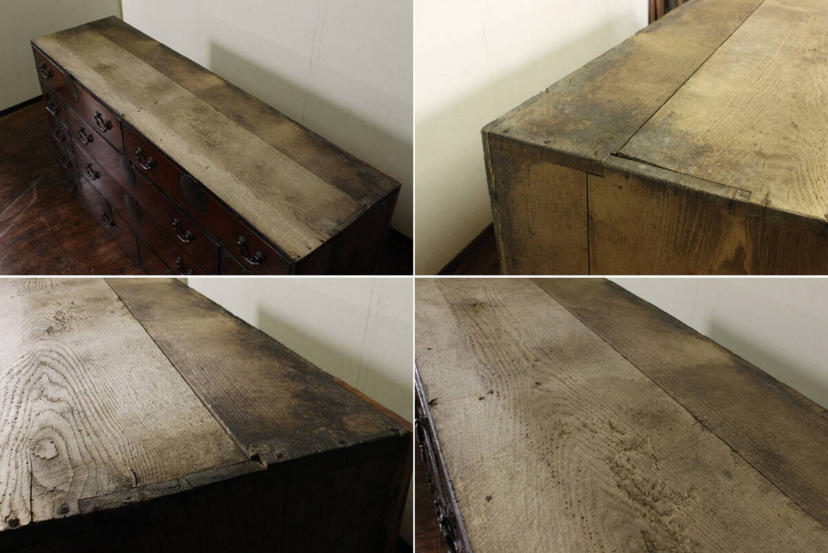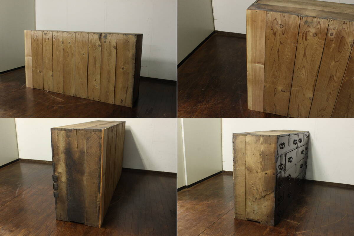 | 商品状態 | 時代物の為、傷み、汚れ・色褪せや、 側・裏板、抽斗底板に割れがありますが使用には特に問題ないかと思われます。 鍵なし施錠不可。 引出し前板に反りがあり突出箇所があります。 引き出し底板に部分的に古い虫くい跡があります。 背板片側の板が欠損していたので無垢板を付けてあります。 |