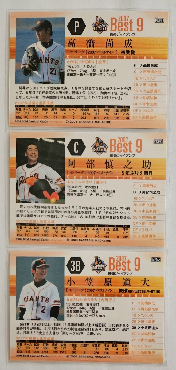 2008年BBM1st 2007ベストナイン 高橋尚成、阿部慎之助、小笠原道大 巨人 ジャイアンツ
