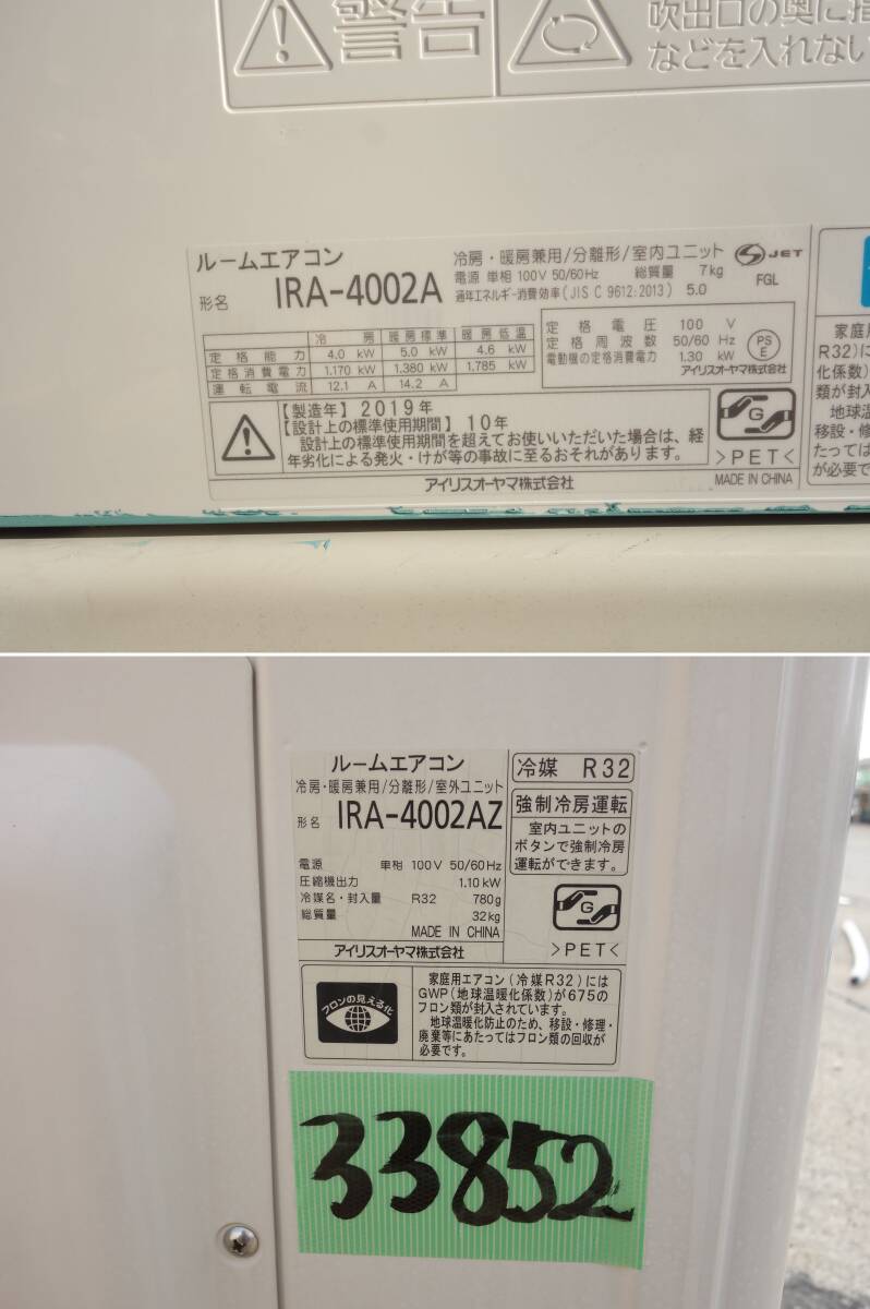 【中古】K▼アイリスオーヤマ ルームエアコン 2019年 4.0kw ~16畳 100v 標準モデル コンパクトタイプ IRA-4002A (33852)