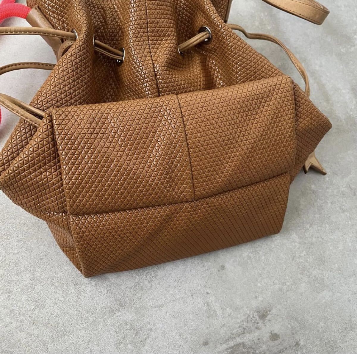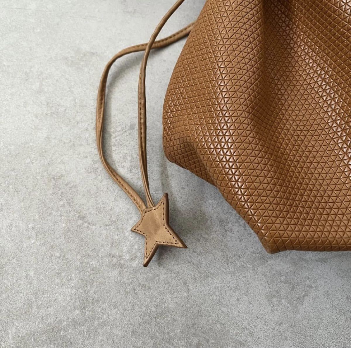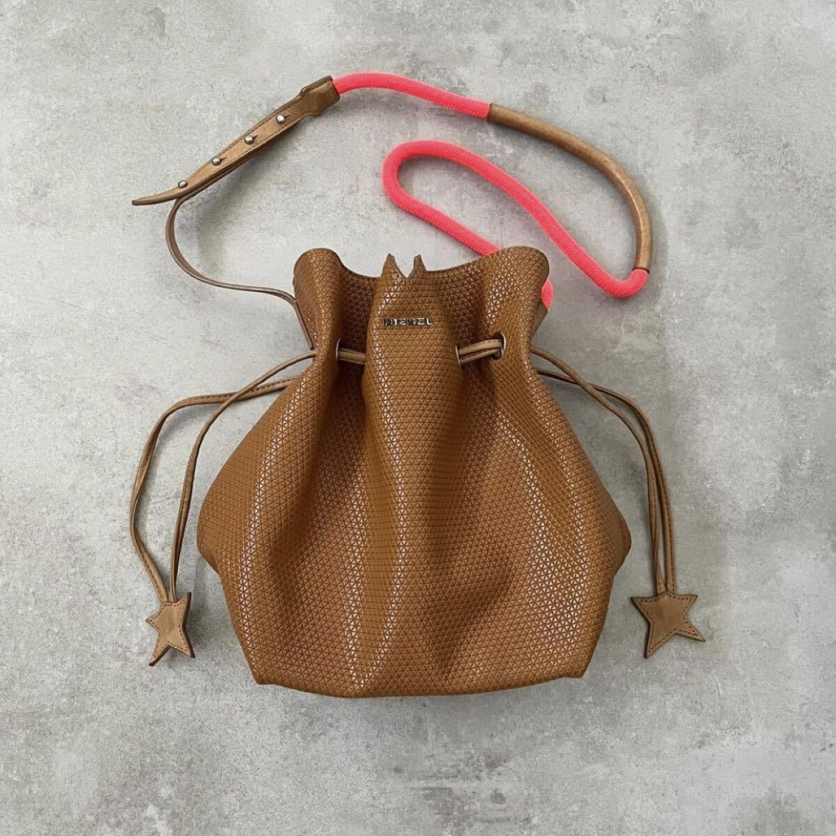 ブラウンの「テクタイト」バケットバッグ。テクスチャード加工の牛革製。星型の端を持つコードトップ。前面にメタルロゴ。ネオンピンクのロープでトリミングされた調節可能なショルダーストラップ。