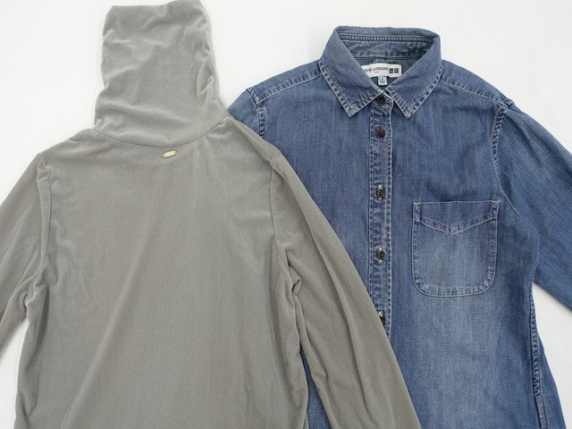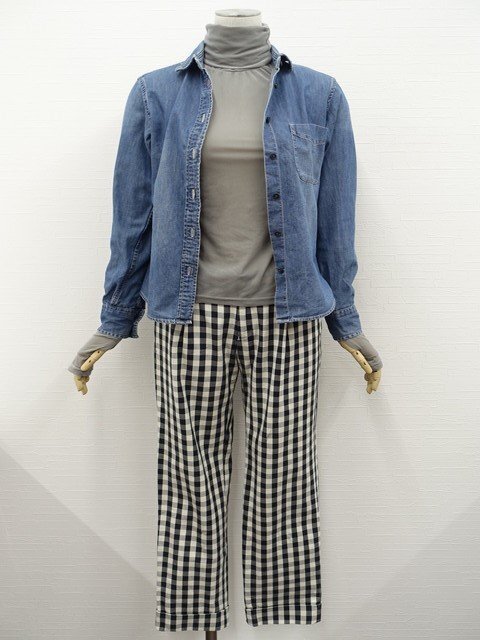 長袖デニムシャツ+長袖ベロアカットソー+テーパードパンツ コーディネート上下3点セット S相当 ブルー系/グレー/ブラック×ホワイト ギンガムチェック カジュアル系 30~40代