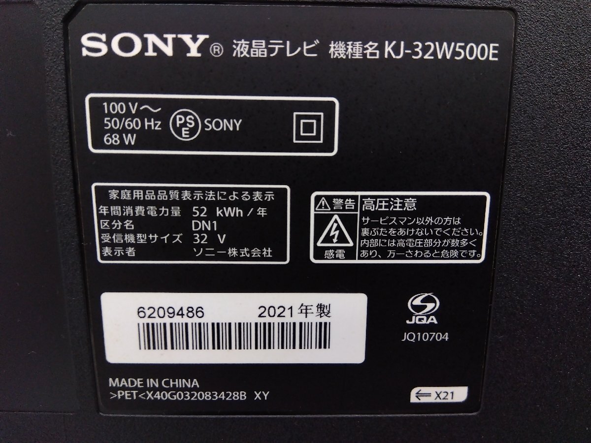 手渡し可 32インチ 液晶テレビ KJ-32W500E ソニー 動作確認済み リモコン B-CAS付 ブラビア BRAVIA 32V型 LEDバックライト SONY 中古 福井