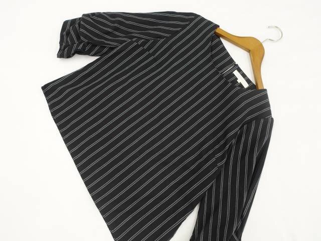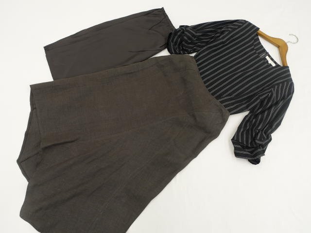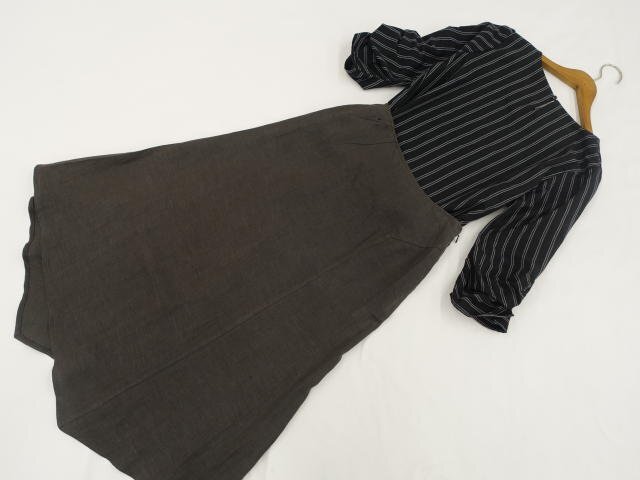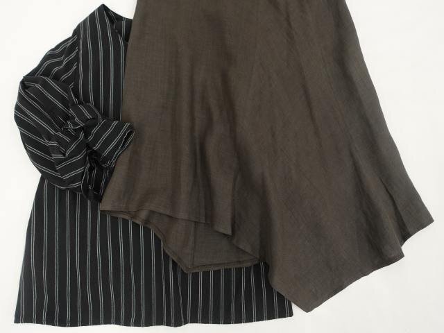 七分袖カットソー+ロング丈ヘムスカート コーディネート上下2点セット M相当 ブラック地 グリーン×ホワイト ストライプ柄/グレー系 カジュアル・シンプル系 20代・30代~