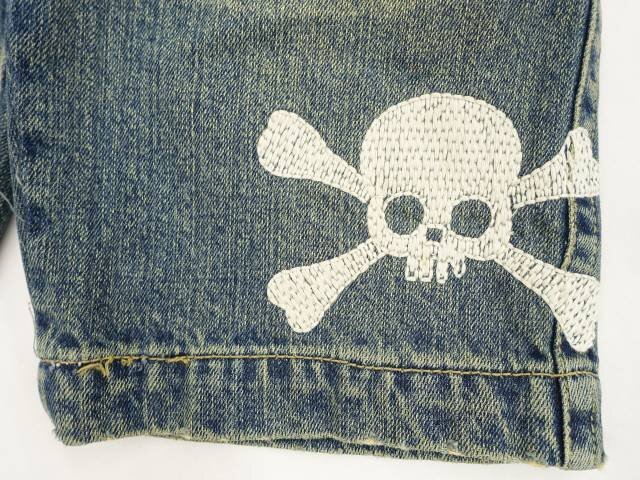 デニムショートパンツ ブルー地 ホワイト スカル柄