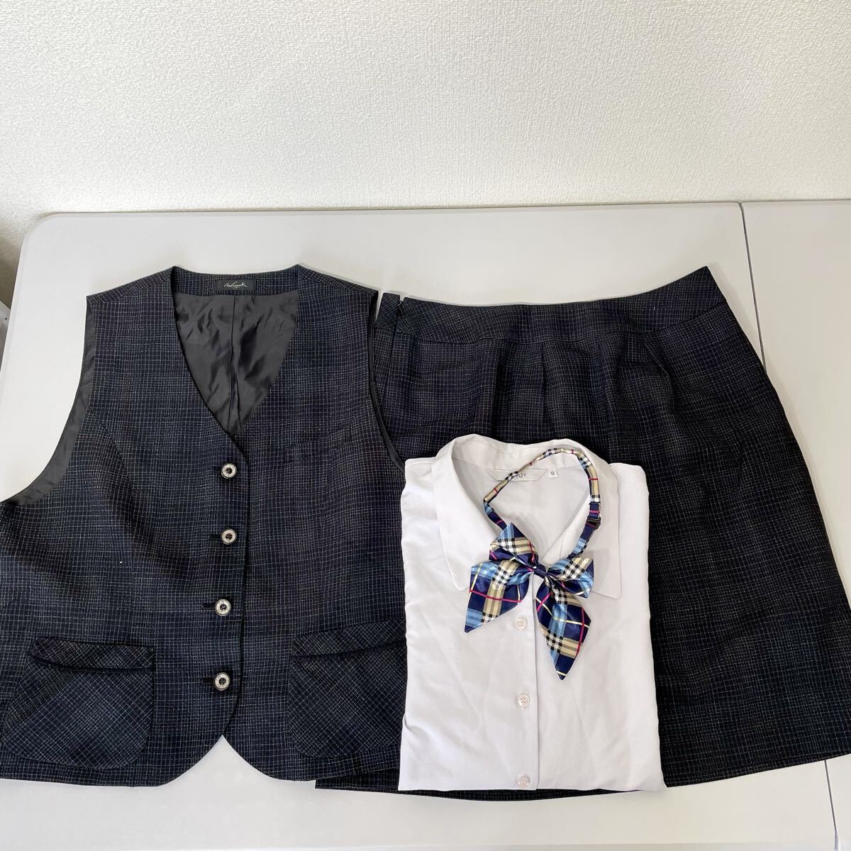 こちらの商品は、中古のスカート、ベスト、ブラウス、リボンの4点セットです。