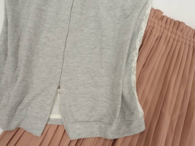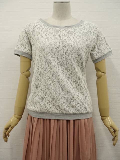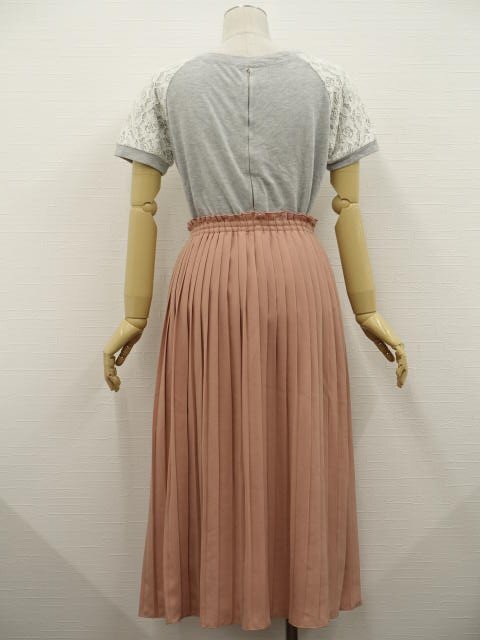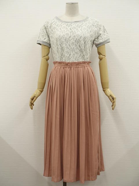 半袖レースカットソー+ロング丈プリーツスカート コーディネート上下2点セット M-L相当 グレー&アイボリー 花柄/ピンクベージュ ガーリー系 20代~30代