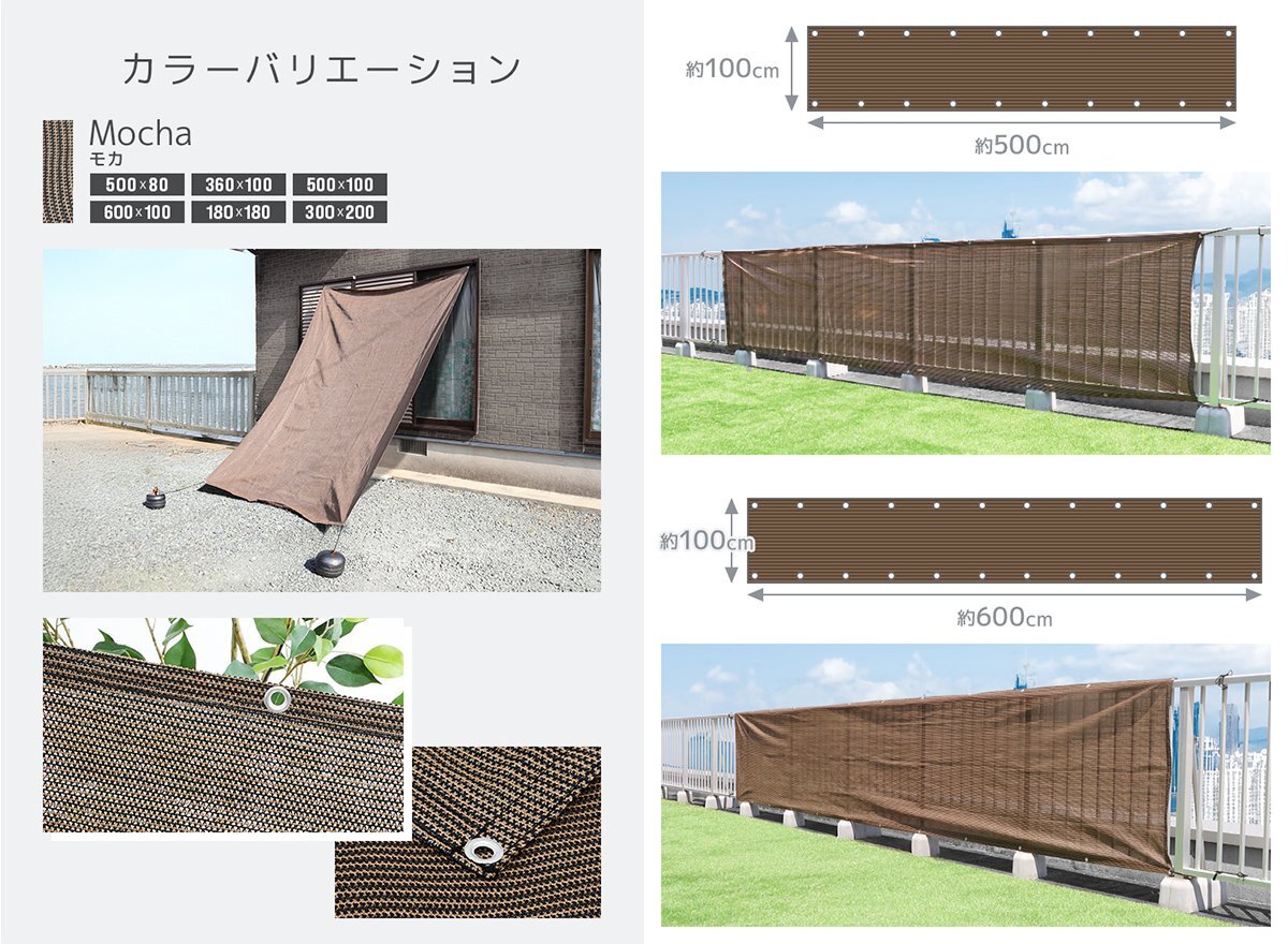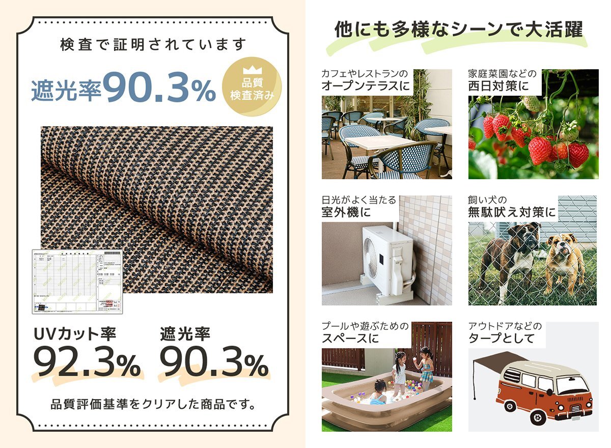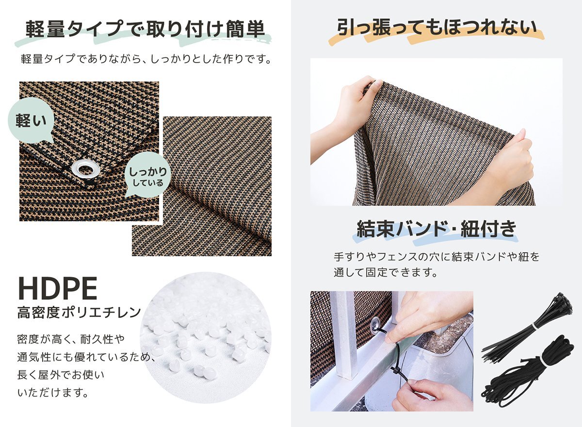 直射日光を和らげる! 暑さ対策と目隠しにも最適な日除けシェードです。 ■風通しのいい通気タイプで快適 UVカット率92%以上&遮光率90%以上! 日差しをしっかりカット!室温上昇を抑制し、 通気性のある素材が風を通すので、快適に過ごすことができます。 ■目隠しにも最適 外からの気になる視線も遮り、プライバシーを守ります。 ■錆びにくいアルミ製のハトメ ハトメを多めに使用しているので、しっかり固定できて安全です。 縦にも横にも使えてピンっと張れます! ■軽量タイプで取り付け簡単 付属の紐や結束バンドを穴に通して固定するだけなので、取り付けも簡単♪ 商品コード:HYS01MOB ■商品仕様 カラー:モカ 材質:HDPE サイズ(約):100×500cm UVカット率:92.3% 遮光率:90.3% ■付属品 ロープ(約160cm)×4本 結束バンド ■保障期間 30日間 ※商品到着後30日以内の初期不良・破損のみご対応させていただきます。 ■注意事項 ※商品は、モニターによって色合いが異なって見える場合があります。 ※仕様・デザインは改良のため予告なく変更することがあります。 【もちろん新品未使用品です】 |