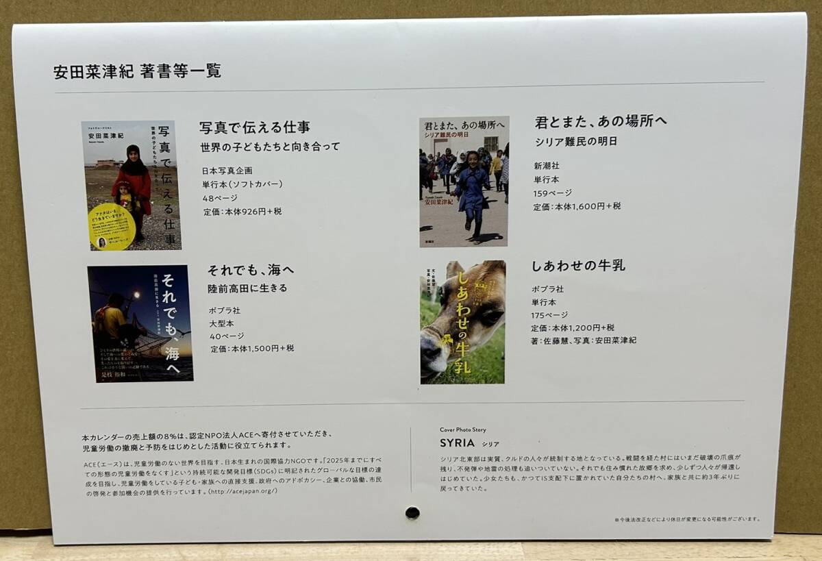 TBSサンデーモーニング等への出演などで有名な写真家、安田菜津紀さん撮影の写真カレンダーです。表紙右上にご本人のサイン入りです。A4サイズ、28ページ。