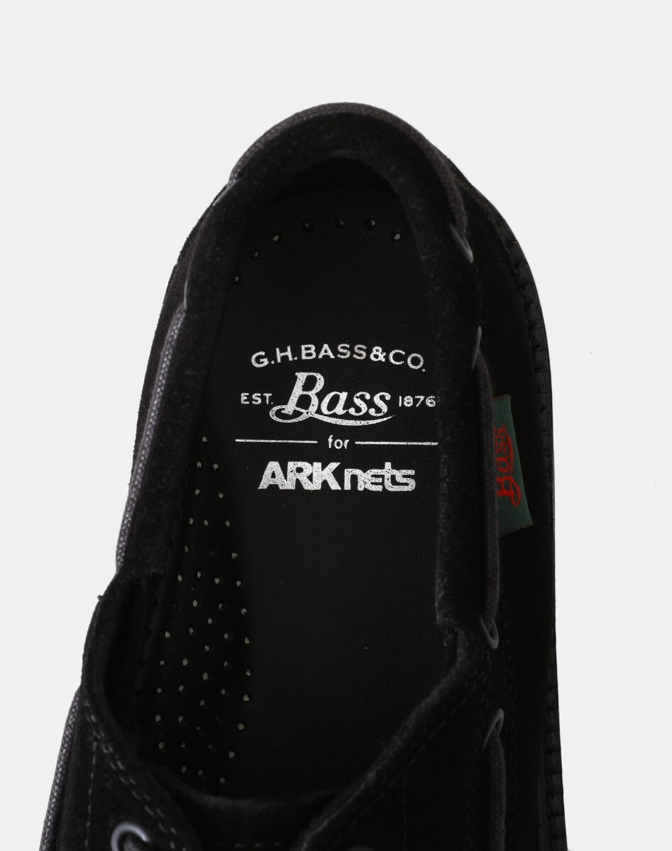 《 G.H.Bass 》に、ARKnetsのエクスクルーシブライン「ONLY ARK」として別注した「RANGER MOC」履き口を囲むようシューレースを施し、甲部分をU字にモカシン縫いしたアッパーを備える限定仕様になります。きめ細やかな質感のスウェードの出品です。