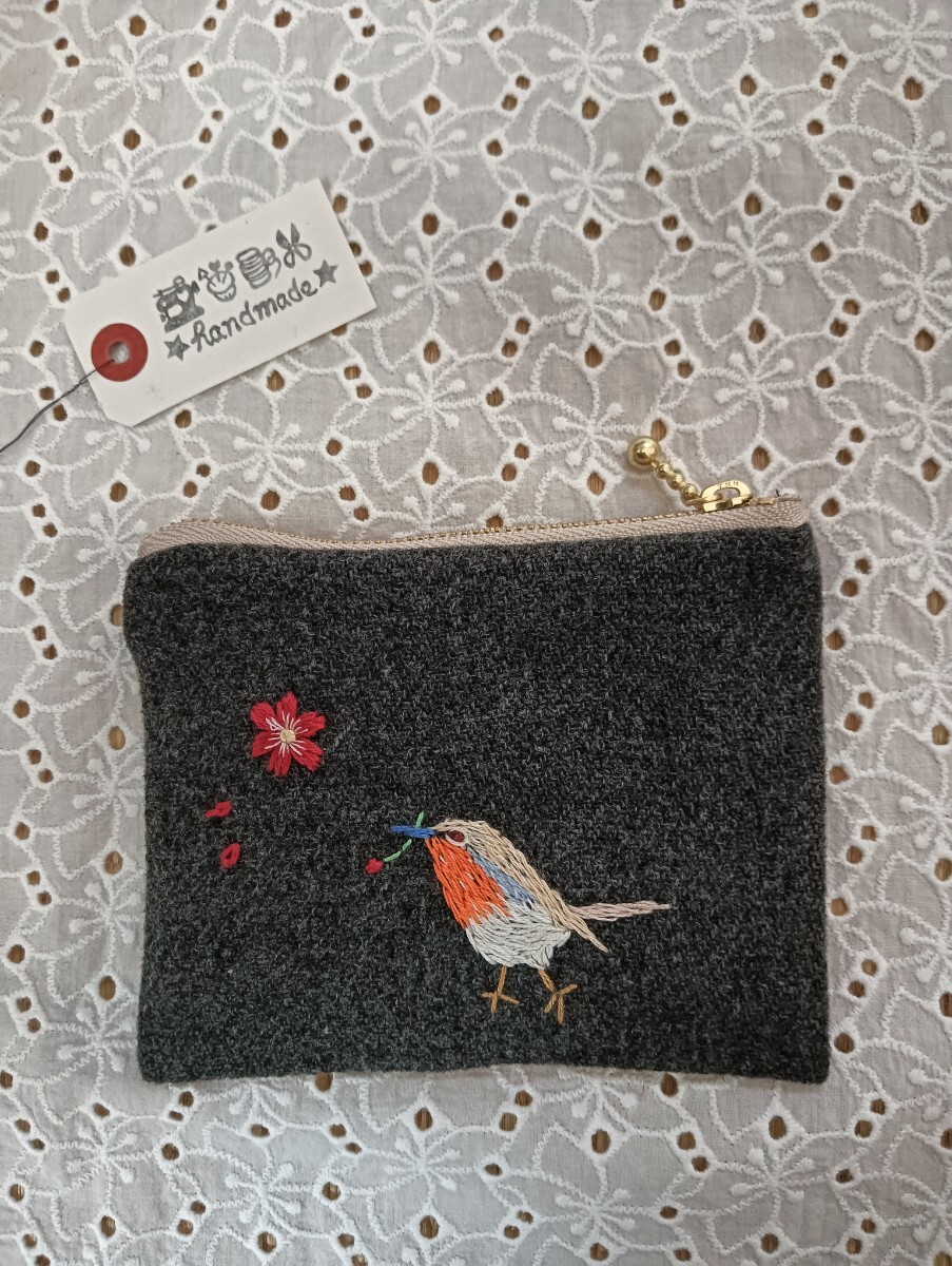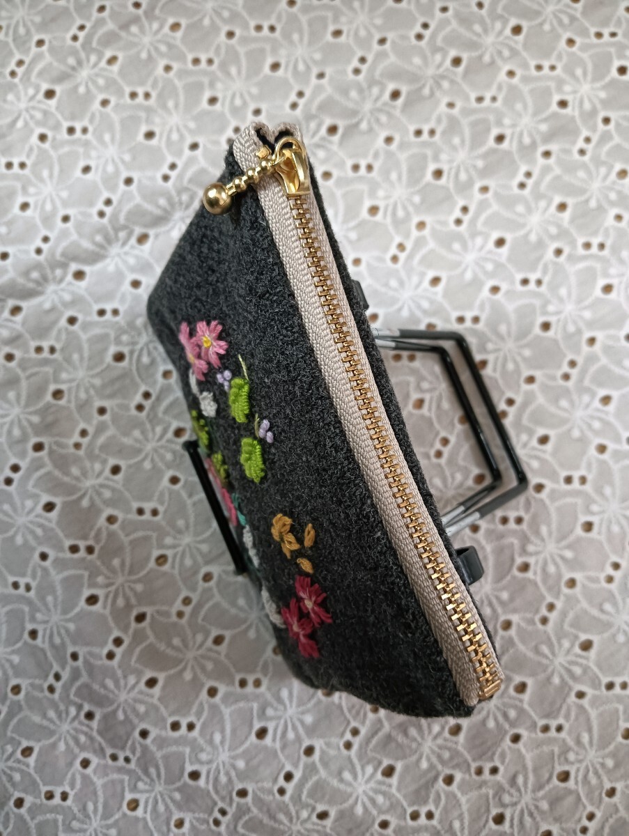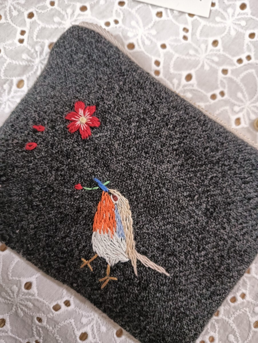 ハンドメイド*手刺繍*ポーチ*温かウール地100*チャコールグレー*ファスナー開閉*鳥と草花