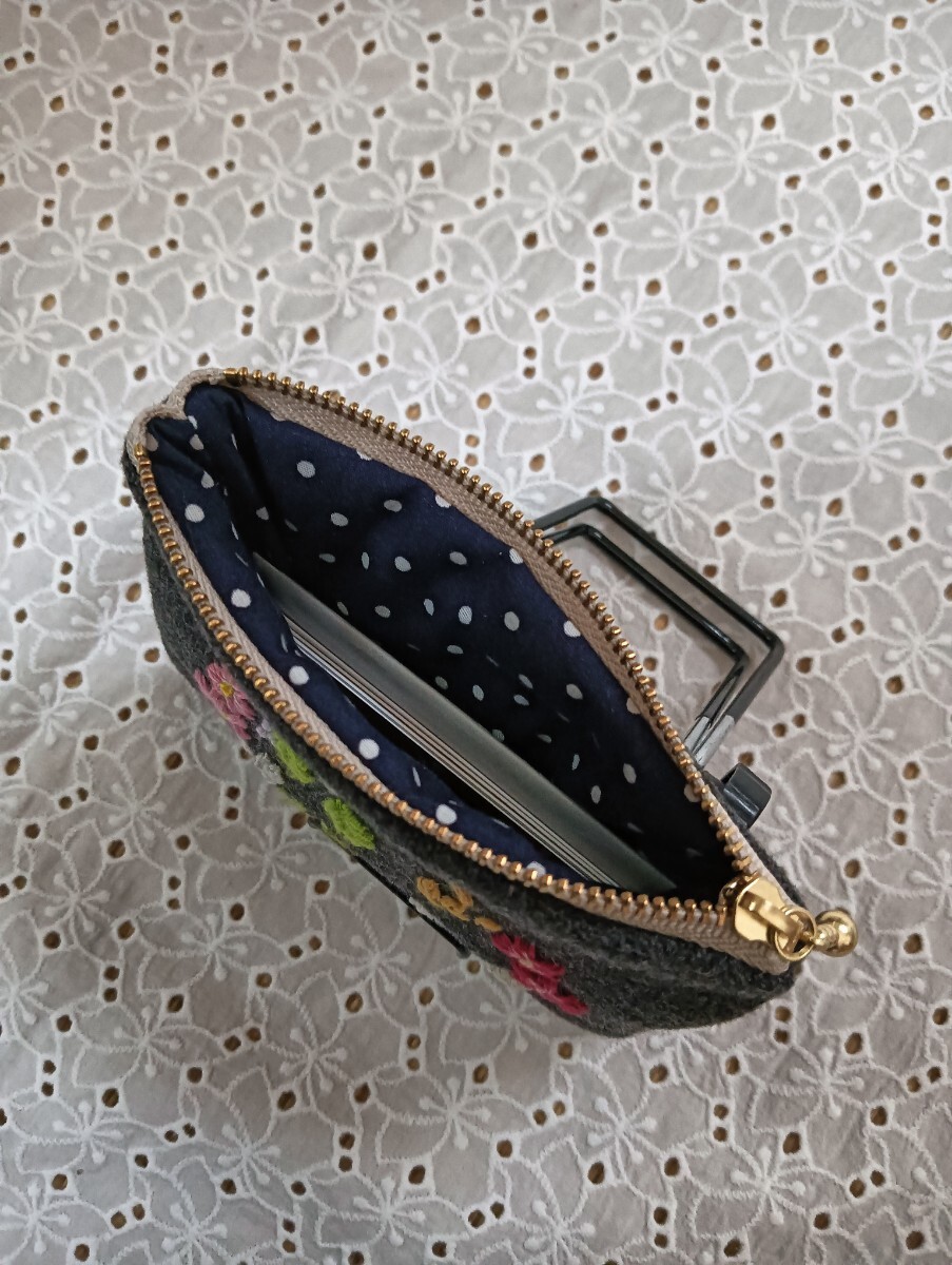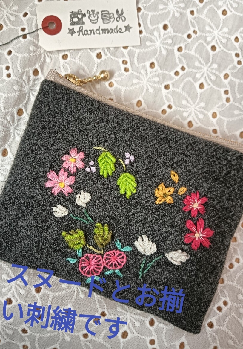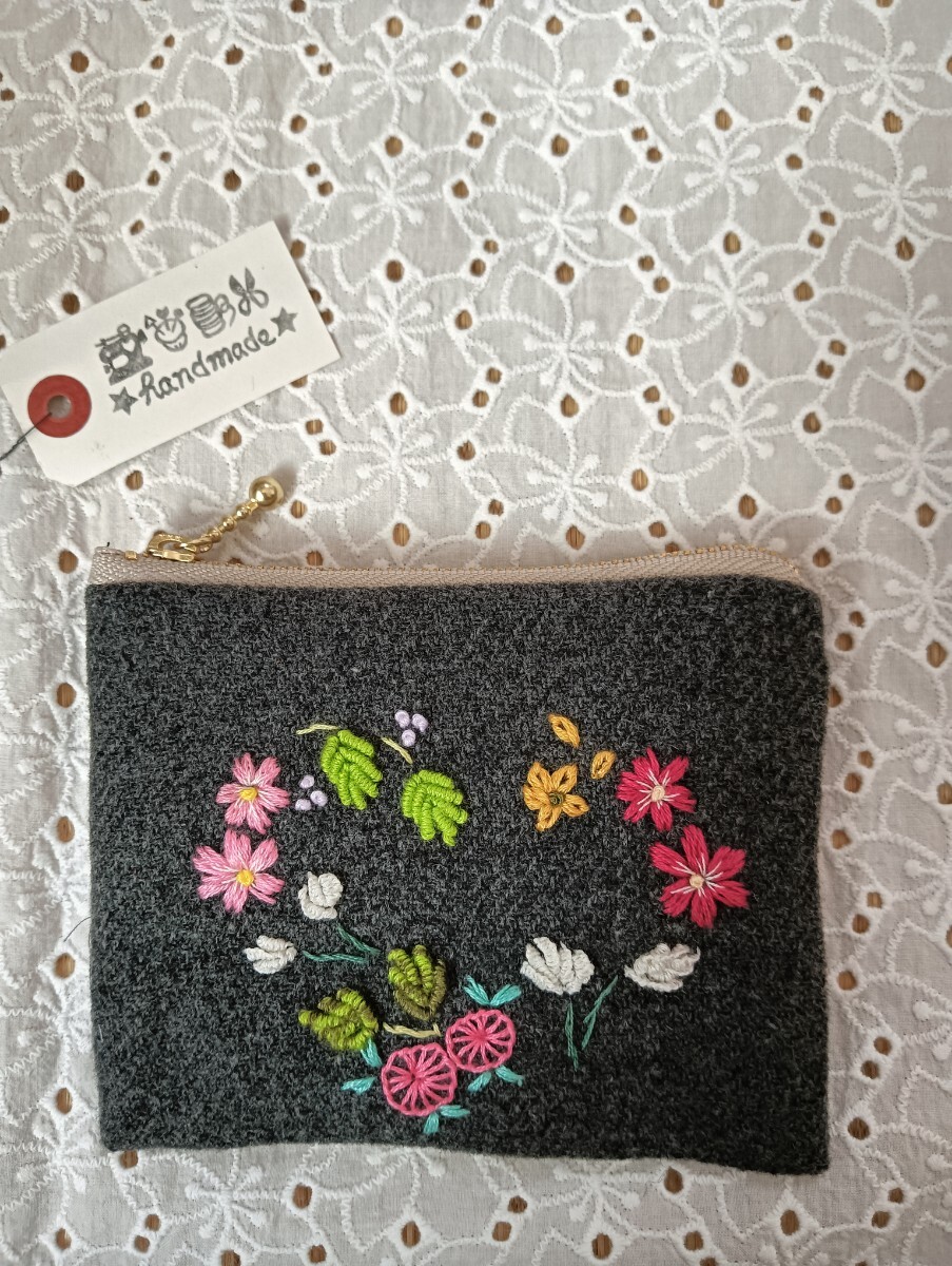 ハンドメイド*手刺繍*ポーチ*温かウール地100*チャコールグレー*ファスナー開閉*鳥と草花