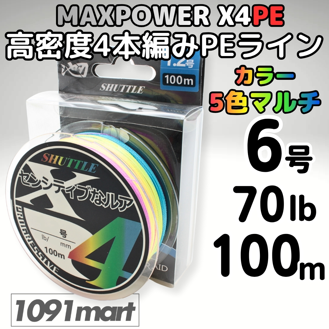 PEライン 6号 70lb 100M巻 5色マルチ 1色/10m 4本編み 高密度PE MAXPOWER X4PE 4本撚り 釣り糸 道糸【1091mart】