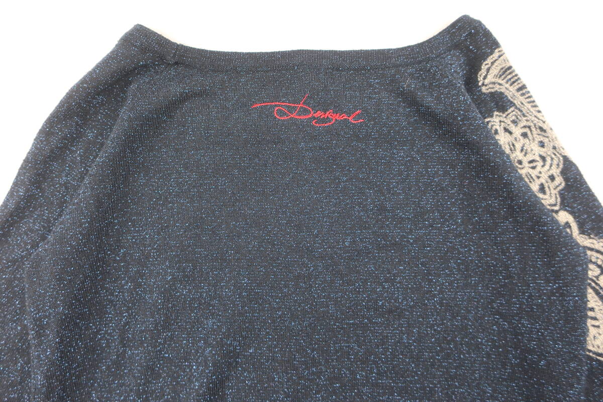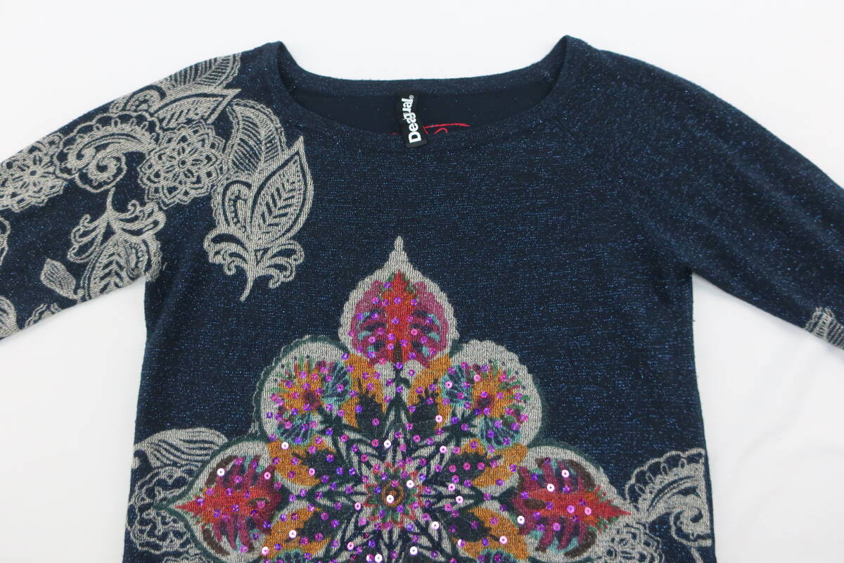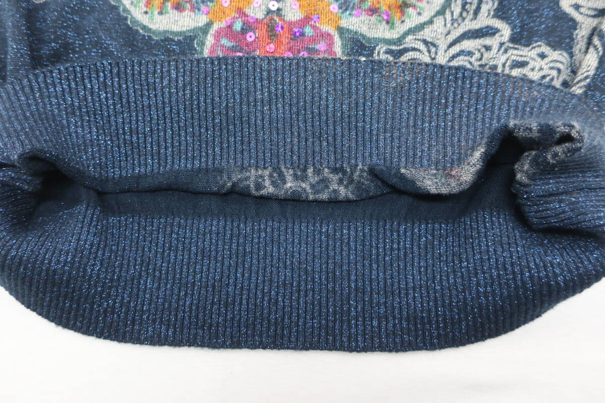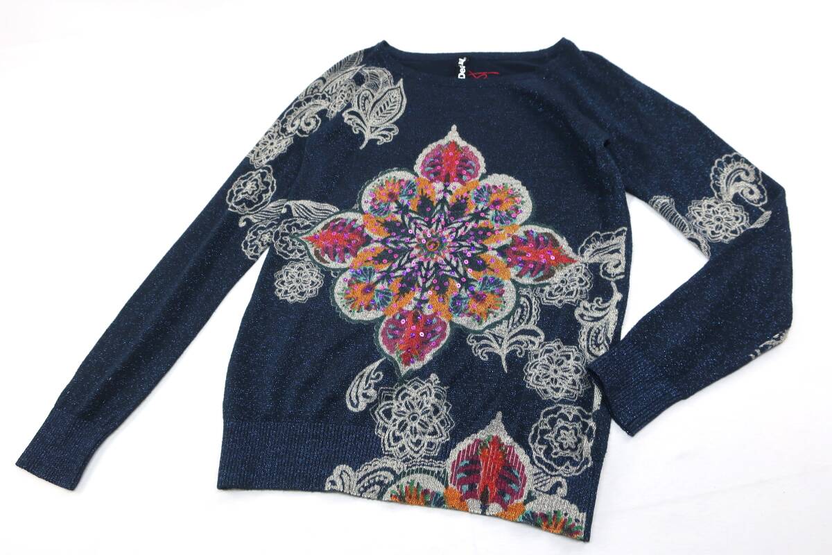 【送900円】2722 Desigual デシグアル レディース ラウンドネックニット セーター 総柄 ネイビー系 S ラメ入り スパンコール
