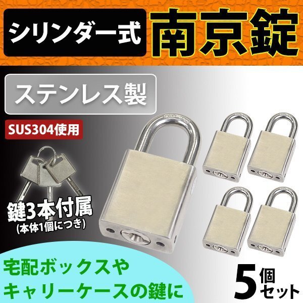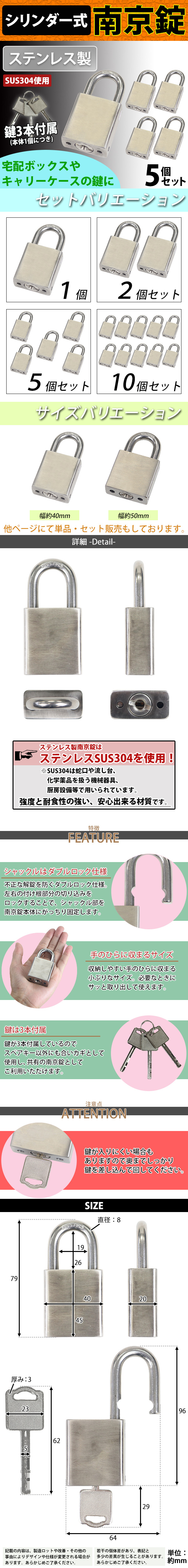 | 商品名 | 送料無料 シリンダー式 ステンレス製 南京錠 幅約40mm 5個 シャックル径約8mm 鍵3本付属 SUS304 オールステンレス ステンレス シリンダー 鍵式 ダブルロック コンビネーション ガードロック 錠前 盗難防止 防犯 宅配ボックス ロッカー ポスト 倉庫 鍵 nanking0405p |