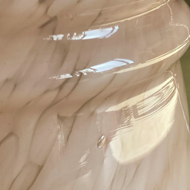 さくらの花びらを思わせる優しい色合いのガラスシェードが届きました。イギリス製、推定1950年代。透明と淡いピンクのガラスが重なり合うことで美しいグラデーションを見せてくれます。昼間は淡い桜色を楽しみ、灯りを燈した時には、ほっと温かみのある空間を演出してくれます。品番【43-466C】。外側はツルツルした質感ですが、内側はツヤなし、ガラス内部には気泡を含みます。