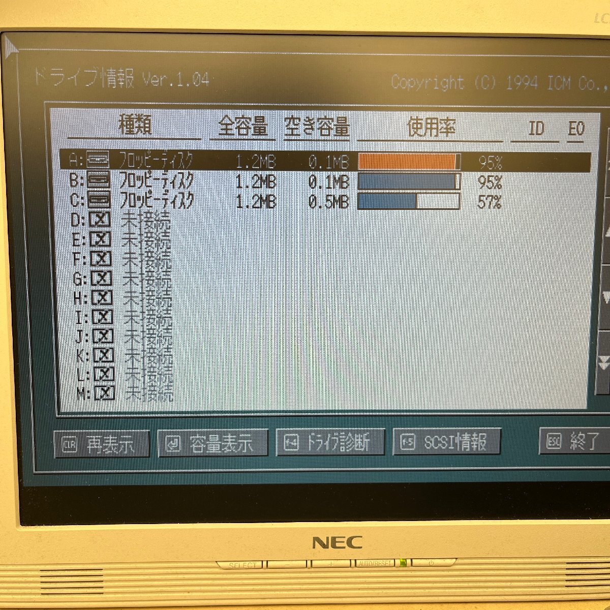 PC-9821Ce2にて、外付けドライブが認識していることを確認しました。