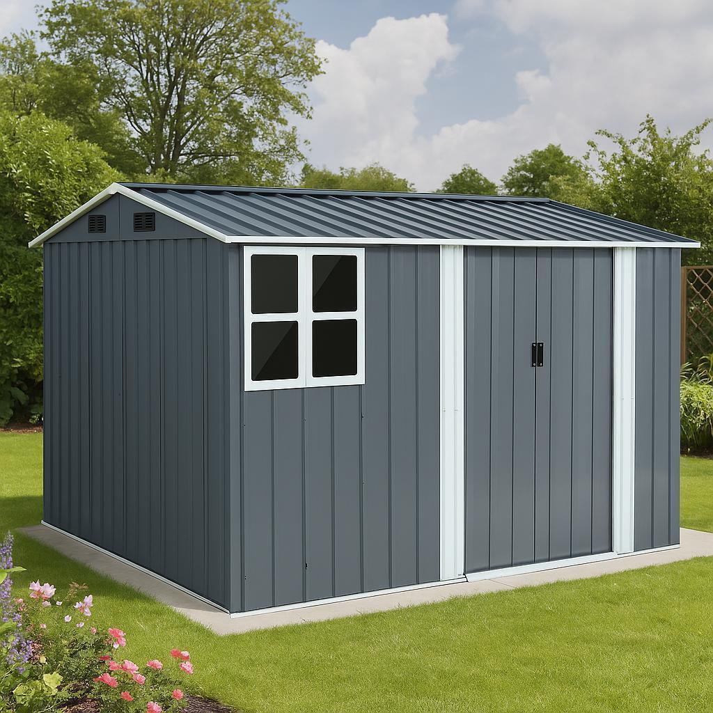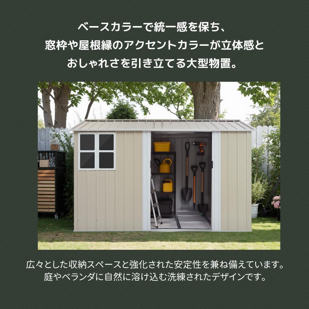 ◎ベースカラーで統一感を保ち、窓枠や屋根縁のアクセントカラーが立体感とおしゃれさを引き立てる大型物置。広々とした収納スペースと強化された安定性を兼ね備えています。庭やベランダに自然に溶け込む洗練されたデザインです。