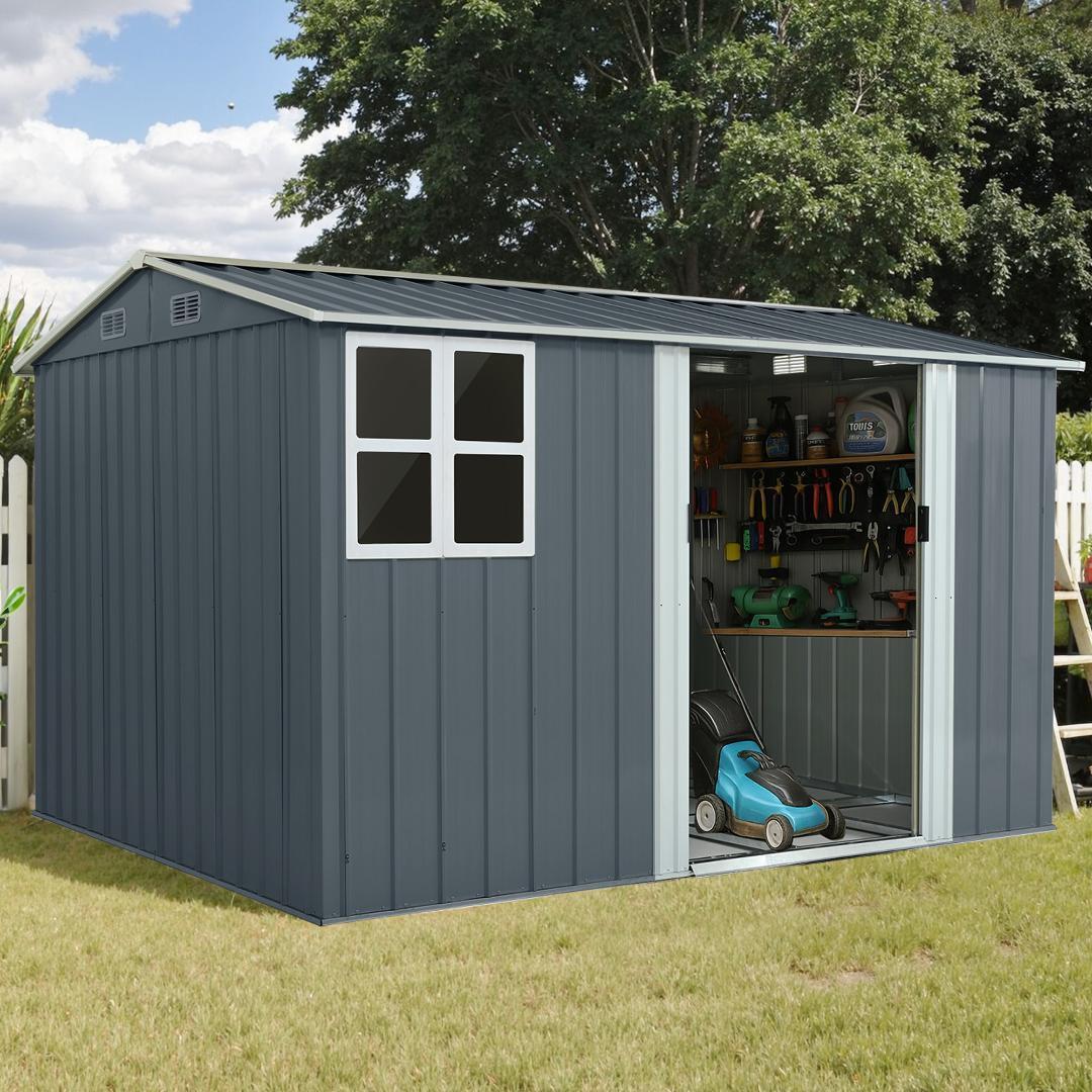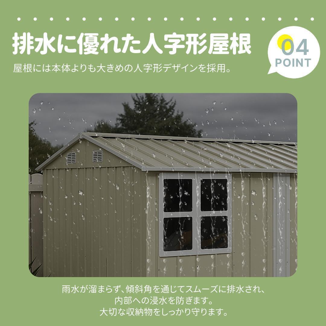 ◎【排水に優れた人字形屋根】屋根には本体よりも大きめの人字形デザインを採用。雨水が溜まらず、傾斜角を通じてスムーズに排水され、内部への浸水を防ぎます。大切な収納物をしっかり守ります。