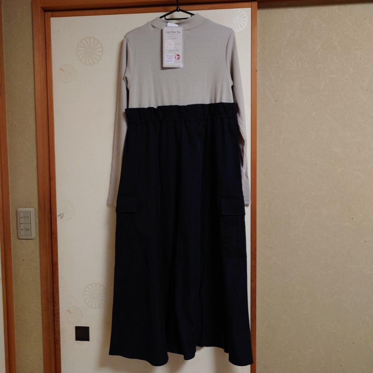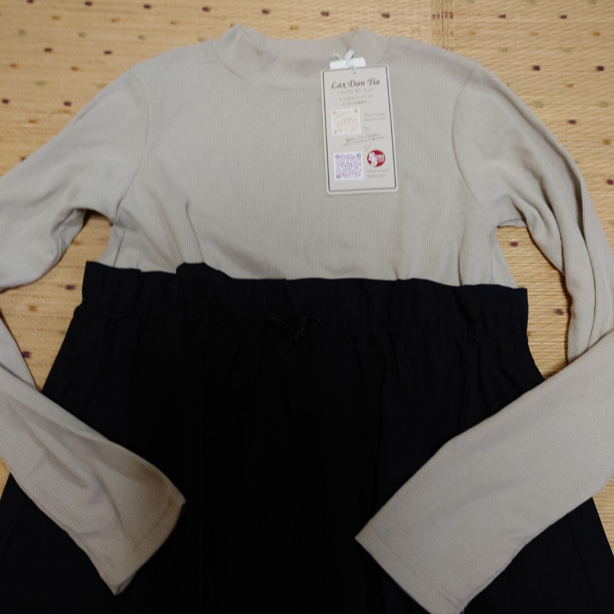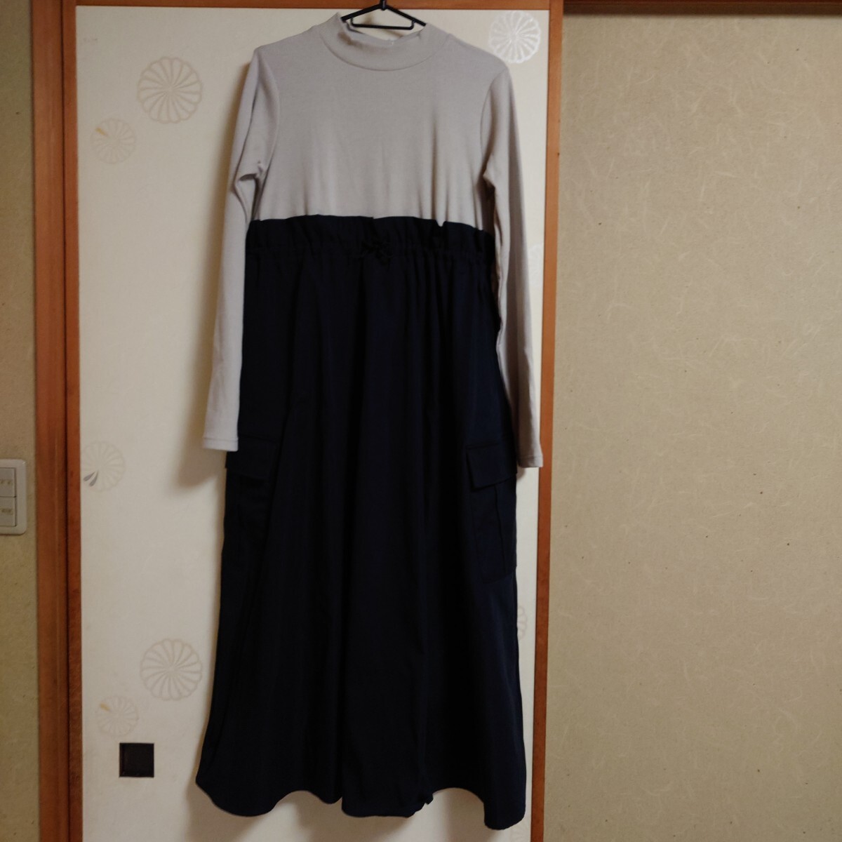 リブのグレージュ上部と黒の異素材ドッキングロングワンピース