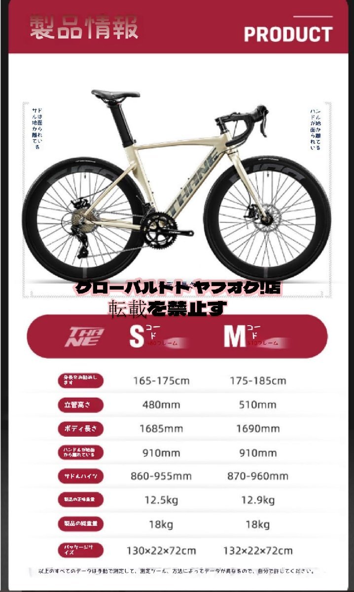 商品の説明■フレーム材質:アルミ ■フレームフレームサイズ:500mm ■タイヤ:700×28c ■チューブバルブ:仏式バルブ ■ブレーキ: 前:ディスクブレーキ 後:ディスクブレーキ ■ブレーキレバー:YINGXIN 製 ■ファイアウォールシフター:「L-TWOO」( 2*8)製 ■ファイアウォール段数:16段防御 ■フロントディレラー:「L-TWOO」 製 ■リアディレラー:「L-TWOO」製 ■重量:約12kg ■ポスト材質:アルミ ■適用身長 :165cm---180cm ■標準装備:スタンド、ペダル、ベル付属品 簡易式レンチ 製品特徴: 軽量アルミフレーム: この自転車は、軽量なアルミフレームを採用し、精密なシームレスな溶接を経ています。これにより、優れた耐久性と軽量性が提供され、さまざまなライディング環境に適しています。 ブレーキ変速一体システム: この自転車には、ブレーキと変速が一体化した高性能システムが搭載されており、迅速なブレーキとスムーズな変速を確保し、乗車時の安全性とコントロール性を向上させています。 高性能タイヤ: 製品には台湾製の正新CSTロード700*28Cレーシングタイヤが装着されており、これらのタイヤは優れたグリップ力と低い転がり抵抗を提供し、より高速でのライディングを可能にします。 人間工学サドル: サドルは人間工学に基づいた中空設計を採用し、優れた快適性を提供するとともに、耐錆性と剛性にも優れています。 高品質コンポーネント: この自転車には、高品質の台湾志?NECOシールドベアリングセット、全アルミ合金レーシングペダル、ダブルウォールアルミ合金スーパーワイドエアロリムなど、高品質なコンポーネントが搭載され、全体の性能と耐久性が向上しています。 この高性能アルミブレーキ変速自転車は、外観だけでなく、性能とデザインにもこだわり抜いた製品であり、都市や田舎の道路でのライディングに理想的な選択肢です。スピード、快適性、多機能性を求めるライダーに対応しています。 注: 付属品は生産バッチに基づいて調整される場合があります。