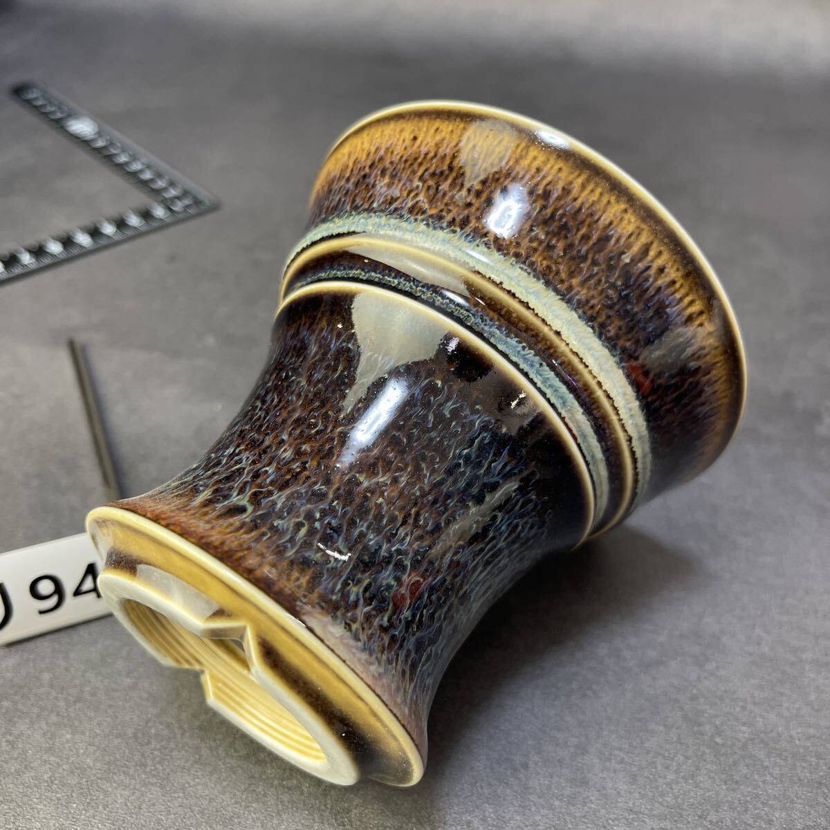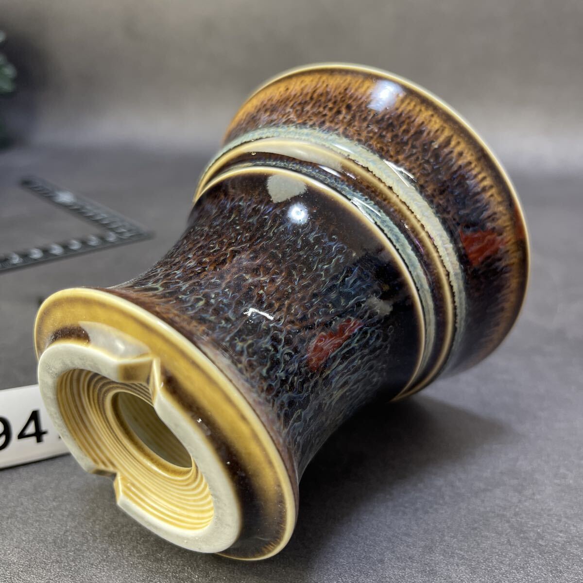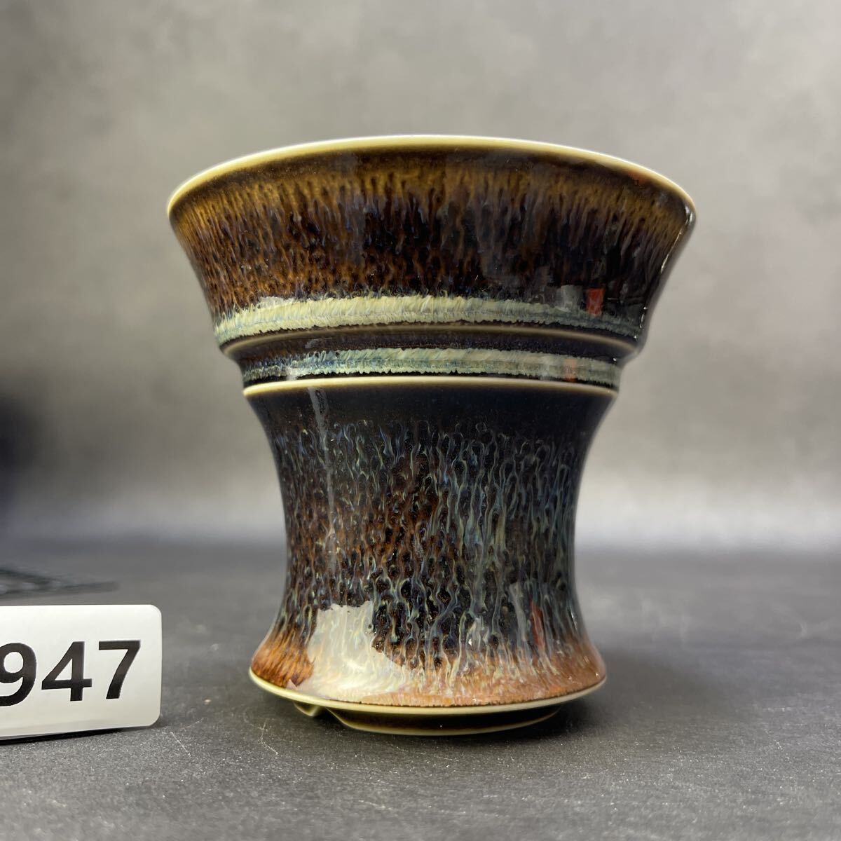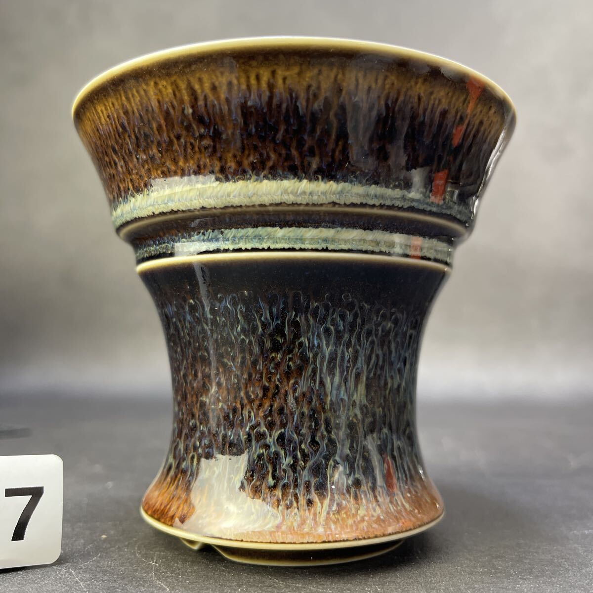 焦褐から琥珀へと移ろう上層釉と、乳白の“冷却帯”が交差する景色は、まるで火山壁の断面を切り出したかのよう。下段に広がる長流の垂れ釉は、鉄釉・マンガン釉・珪質釉が高温域で熔け合い、重力によって引き伸ばされた“熔岩樹根”の表情です。温度勾配と酸化還元の切り替えが揃わなければ生まれない窯変景色。
