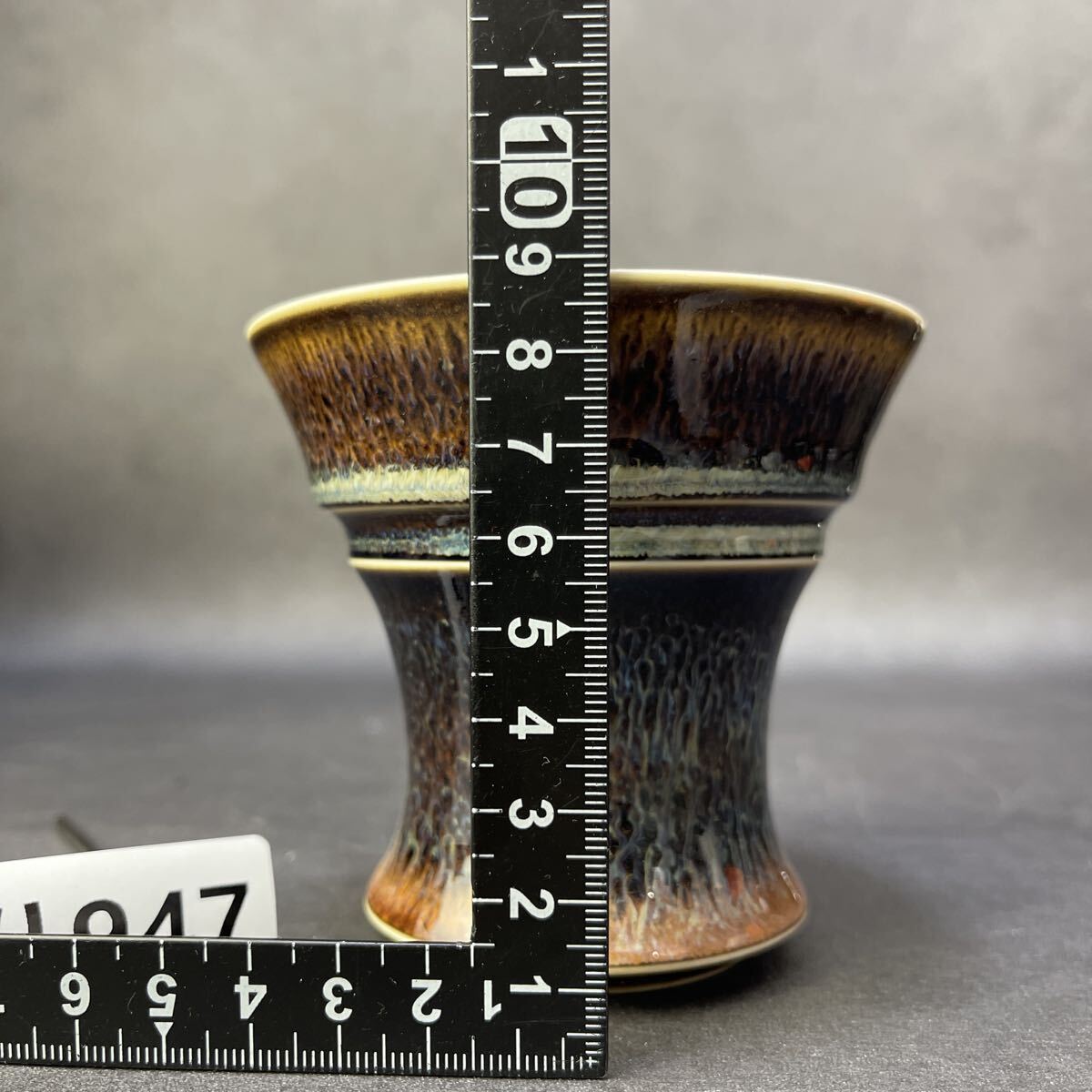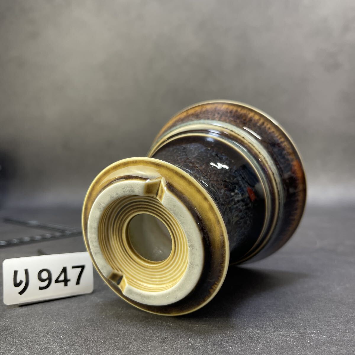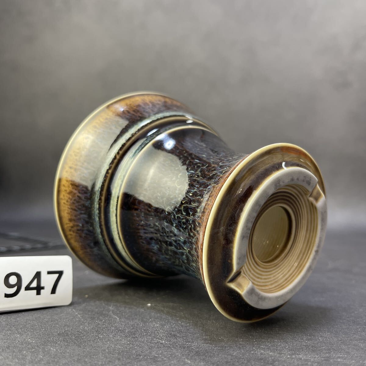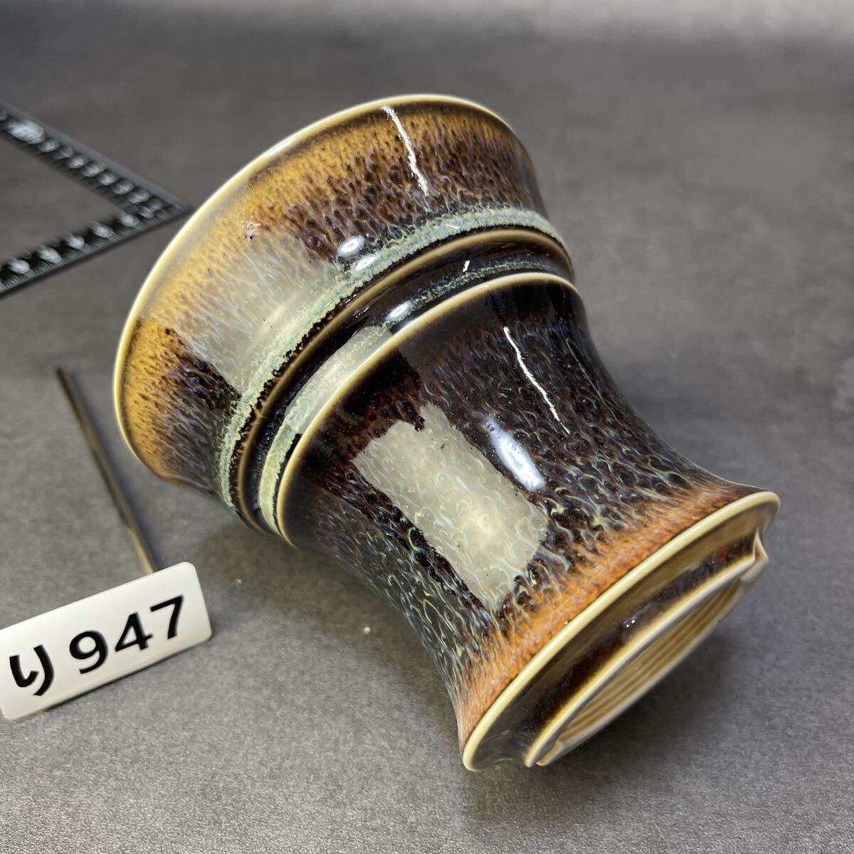 焦褐から琥珀へと移ろう上層釉と、乳白の“冷却帯”が交差する景色は、まるで火山壁の断面を切り出したかのよう。下段に広がる長流の垂れ釉は、鉄釉・マンガン釉・珪質釉が高温域で熔け合い、重力によって引き伸ばされた“熔岩樹根”の表情です。温度勾配と酸化還元の切り替えが揃わなければ生まれない窯変景色。