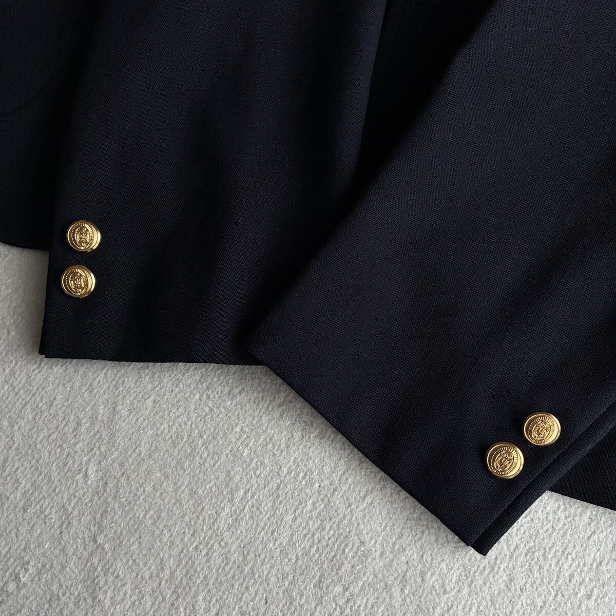 ダークネイビーに映える金ボタンが高貴さを演出してくれ、華のあるジャケットに仕上がってます。