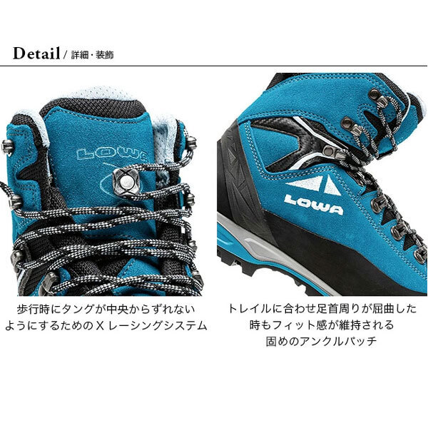 | 内 容 | ■レディース LOWA トレッキングブーツ アルパインエクスパートII GTX(L220022-6975) ■サイズ:UK5/23.5cm相当 全高約20cm ■カラー:ターコイズ/アイスブルー ◆参考価格 75900円相当 アルパインエクスパートの最大の特徴は軽量でありながら、 Gore-TexRとPrimaloftR400を組み合わせ 圧倒的な保温性を確保しているトレッキングブーツです。 更にゆったりとしたラスト、アブソーバーを内蔵した特別設計のシャンク、 厚みを抑え高い歩行性能を実現したソールも人気の理由です。 アップデートされたこのモデルは、くるぶし部分のパーツを変更し プレッシャーポイントを軽減させると同時にフィット感の向上を目指しました。 |