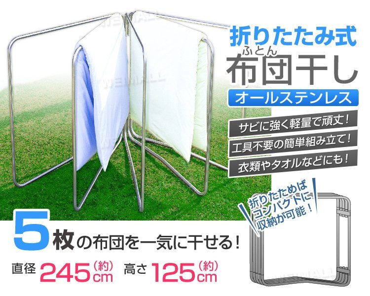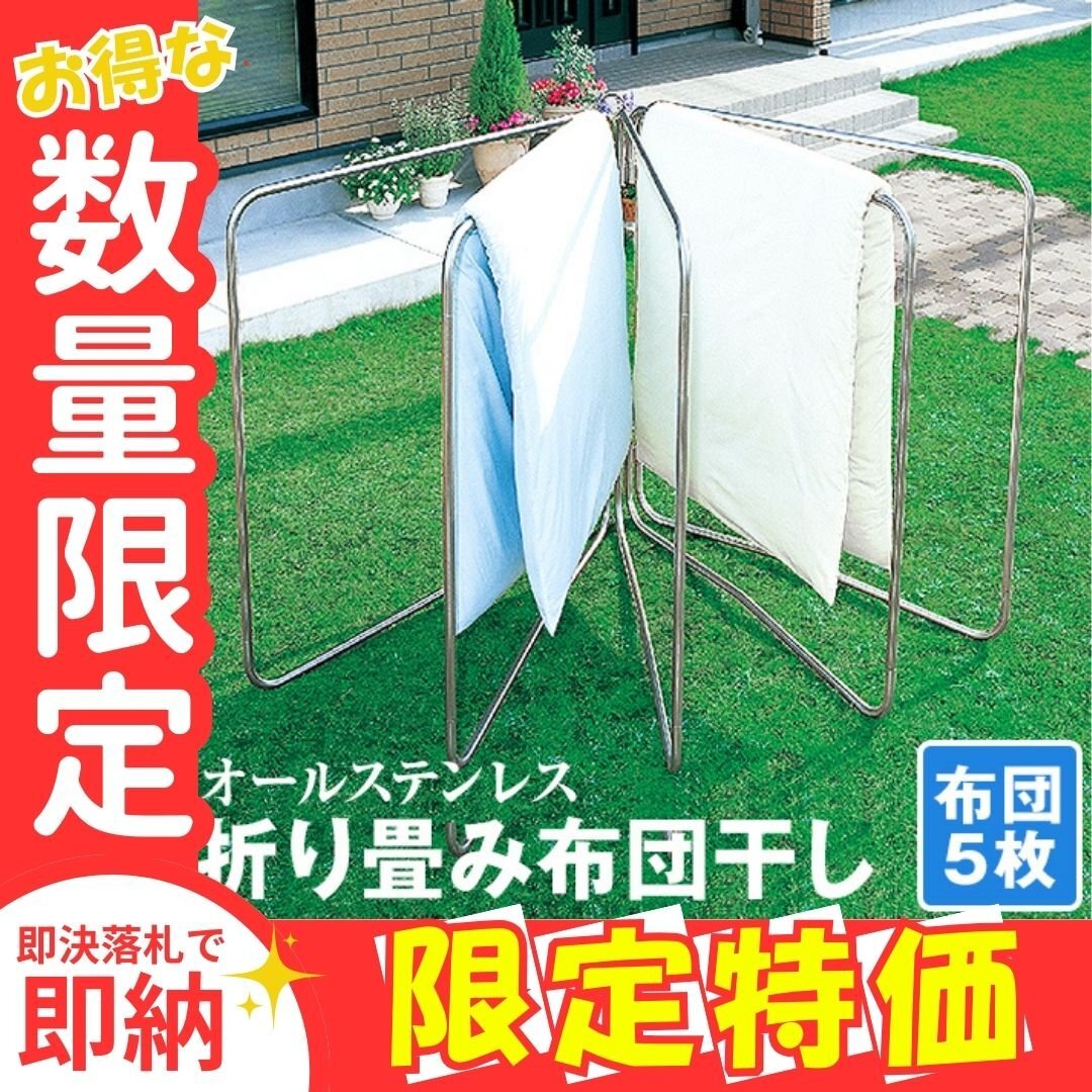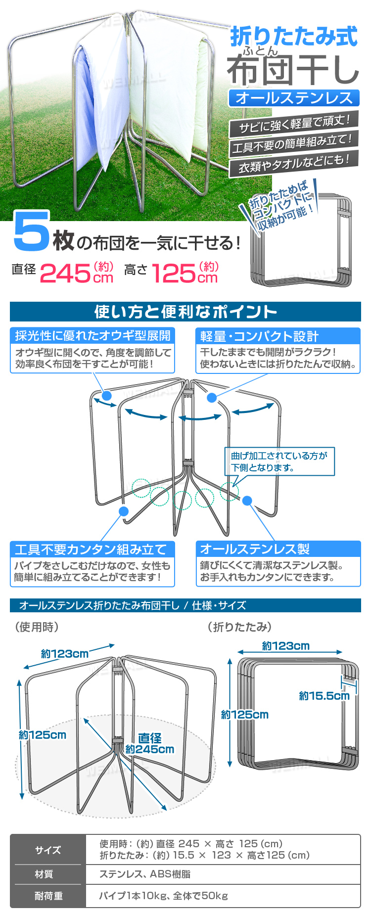 5枚の布団を一気に干せる! オールステンレス製ふとん干しです。 広げて干せる、布団を掛けやすい扇型タイプ。 フレームの角に丸みがあり、重い布団の掛け外しもスムースです♪ ステンレスだからサビに強く、丈夫で長持ち。 軽いので出し入れ・持ち運びラクラク。 使用しない時はコンパクトに折りたたんで収納可能。 ドライバー不要・差し込むだけで組み立てカンタン!! 布団以外にもハンガーやバスタオル、バスマットなども干せます♪ ●仕様 使用サイズ(約):幅123×高さ125cm(直径245cm) 収納サイズ(約):幅123×奥行15.5×高さ125cm 重量(約):5.8kg 耐荷重(約):全体50kg(パイプ1本あたり10kg) 材質:ステンレス、ABS樹脂 干す量(目安):布団5枚 【注意事項】 ・お客様組立商品です。 ・風の強い日は屋外でのご使用はおやめください。倒れる場合があります。 ・必ず平坦な場所に設置し、転倒しないようバランスよく干してください。 ・お子様がぶら下がったり登ったりして遊ばないようご注意ください。 |