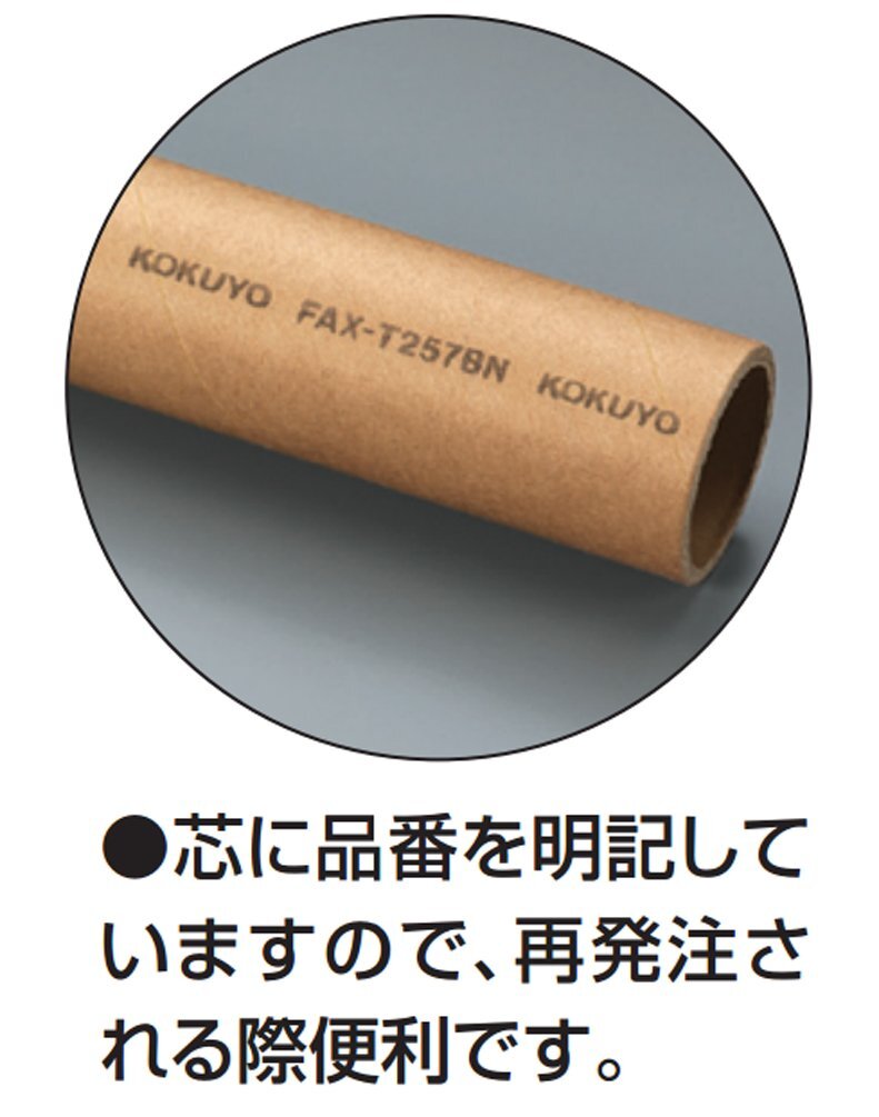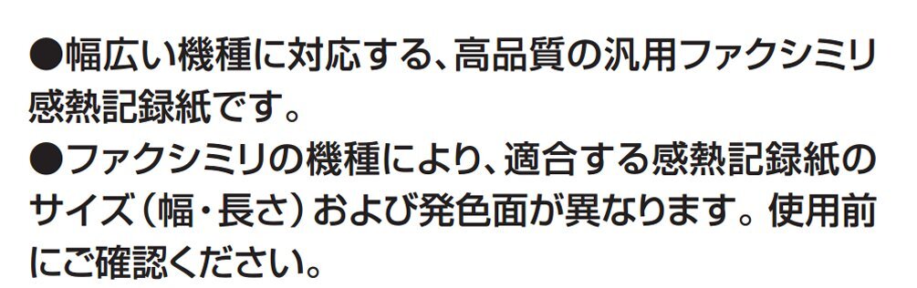より 幅広い機種に対応する、高品質の汎用ファクシミリ感熱記録紙 ファクシミリの機種により、適合する感熱記録紙のサイズ(幅・長さ)および発色面(表面発色・裏面発色)が異なる。使用前にご確認ください。 商品紹介 ●幅広い機種に対応する、高品質の汎用ファクシミリ感熱記録紙です。 ●ファクシミリの機種により、適合する感熱記録紙のサイズ(幅、長さ)および発色面(表面発色、裏面発色)が異なりますので、使用前にご確認ください。 ●芯に品番を明記していますので、再注文される際便利です。