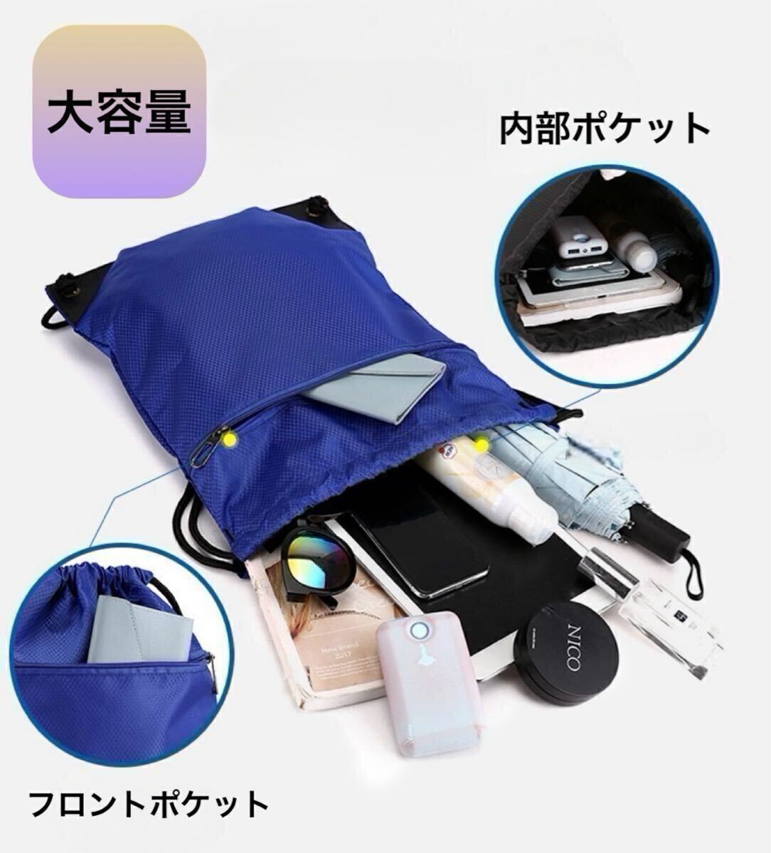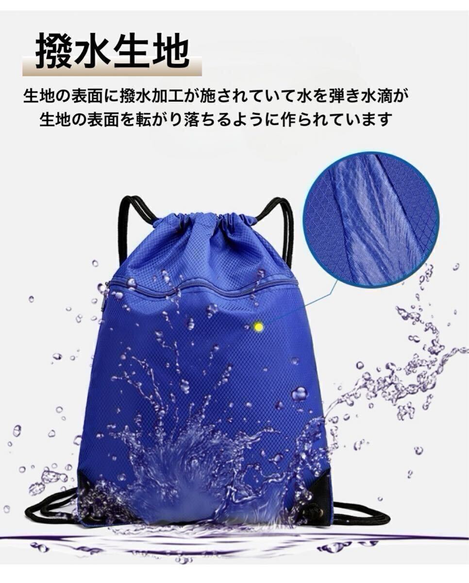 このナップサックは、さまざまなシーンで活躍する防水・撥水機能を持つ巾着バッグです。ジムやプール、旅行など多用途で使える大容量設計が特徴です。オックスフォード布を使用しており耐久性に優れ長期間使用することができます。特に撥水性があるため突然の雨や水しぶきから中身をしっかりと守ることができるのが嬉しいポイントです。