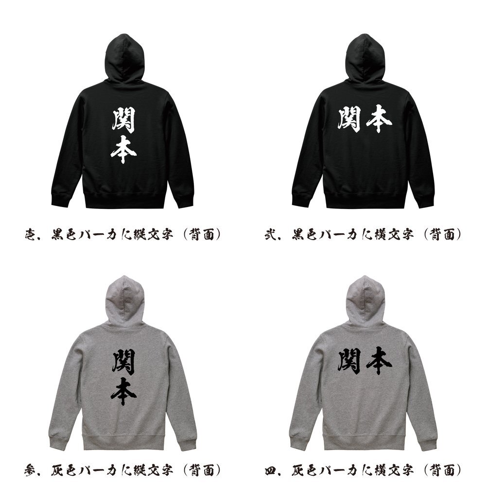 関本 オリジナル パーカ 書道家が書く プリント フルジップ パーカー S M L XL XXL 110 130 150 【 名字 】