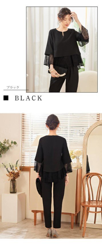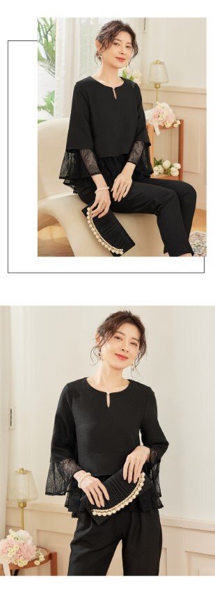・首元にあるパールでアクセサリーなしでも十分な装い。ウエスト部分はペプラムデザインでウエストを細く見せ、女性らしいシルエットに仕立ててくれます。