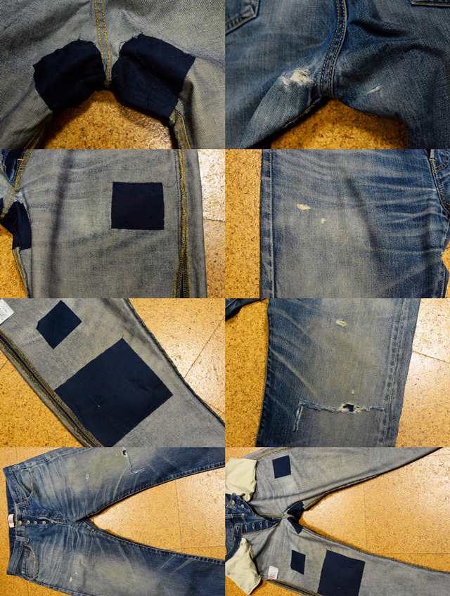 ダメージ加工に加え色落ち加工とダメージ加工の箇所をタタキと呼ばれるリペア加工された物(ポケット周りや裾周り、フロントダメージも含む)