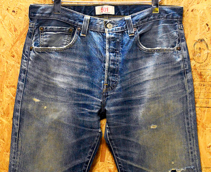 フロントにやや傷とダメージと色落ち加工がされた物(本商品 / ポケット周りや裾周り、フロントダメージ)
