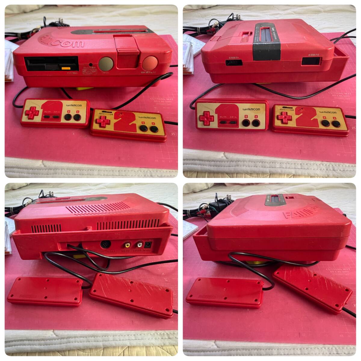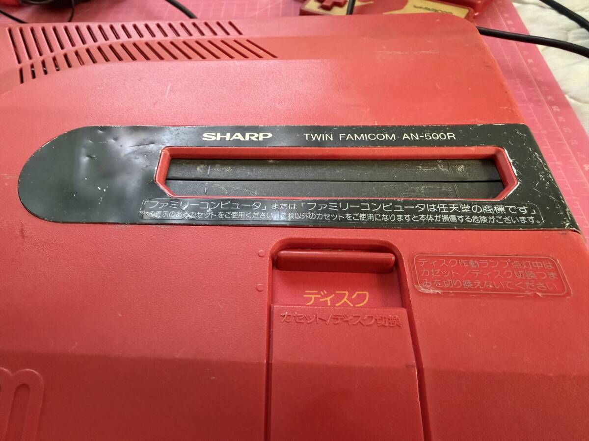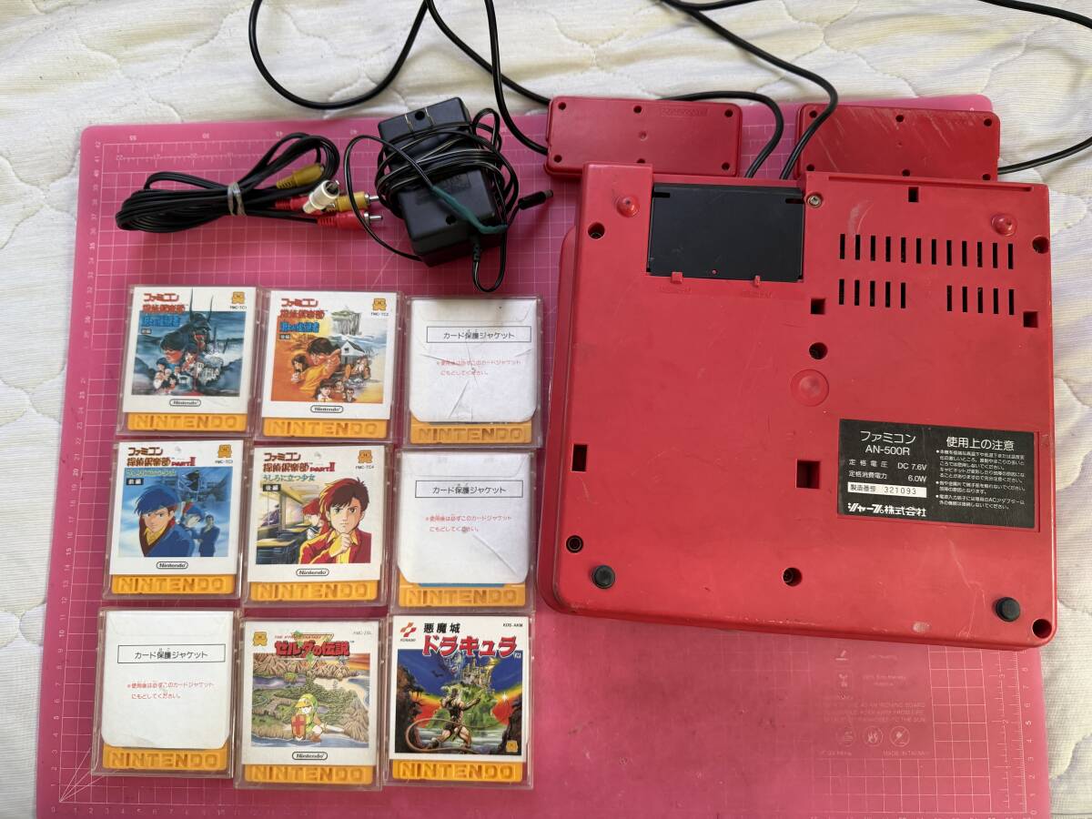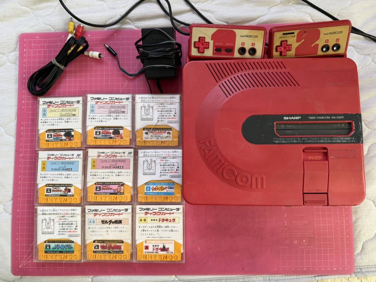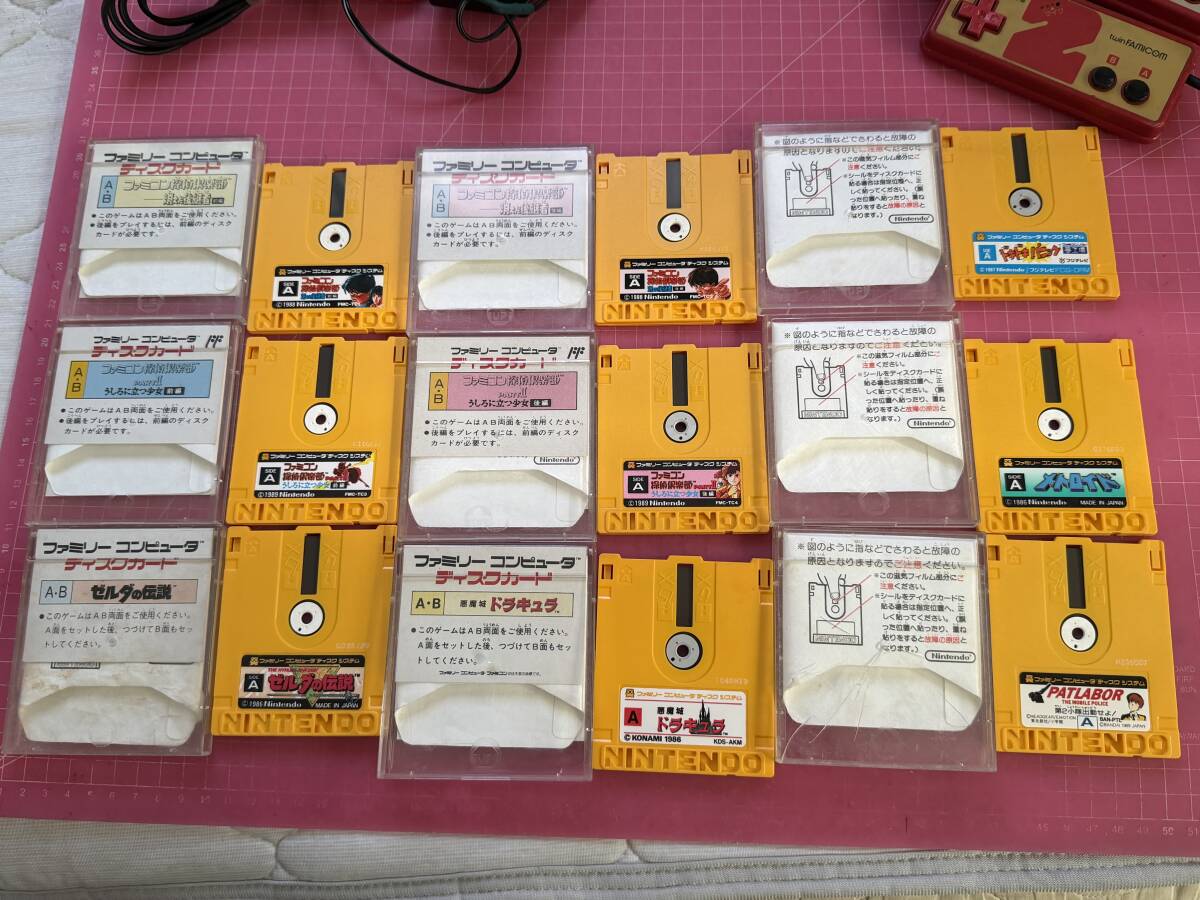 ・ツインファミコン本体(プロテクト無し Nintendo表示の最初期型) 赤 、ディスクカード9枚、純正中古ACアダプタ(断線修理済み)、AVコード、の計12点です。