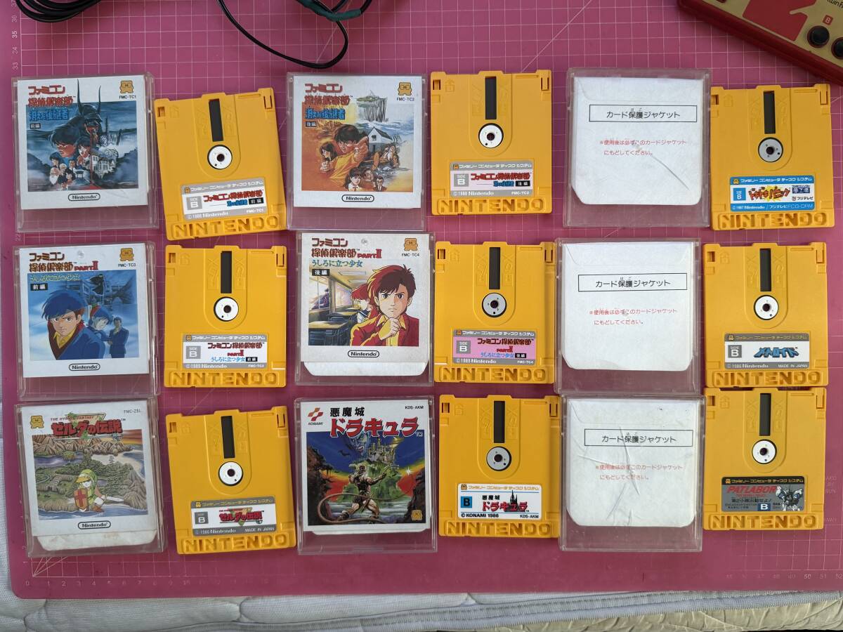 ・ディスクカードは両面の ゼルダの伝説(純正ラベル有り、純正ジャケット有り、プラケース有り) 。両面の 悪魔城ドラキュラ(純正ラベル有り、純正ジャケット有り、プラケース有り)。両面の メトロイド(純正ラベル有り、純正ジャケット無し、プラケース有り)。両面の パトレイバー(純正ラベル有り、純正ジャケット無し、プラケースに割れあり)。両面の 夢工場ドキドキパニック(純正ラベル有り、純正ジャケット無し、プラケース割れあり)。両面の 消えた後継者 前編(純正ラベル有り、純正ジャケット有り、プラケース有り) 。 両面の 消えた後継者 後編(純正ラベル有り、純正ジャケット有り、プラケースに割れあり) 。両面の うしろに立つ少女 前編(純正ラベル有り、純正ジャケット有り、プラケース有り) 。両面の うしろに立つ少女 後編(純正ラベル有り、純正ジャケット有り、プラケース有り) 。の計9枚になります。